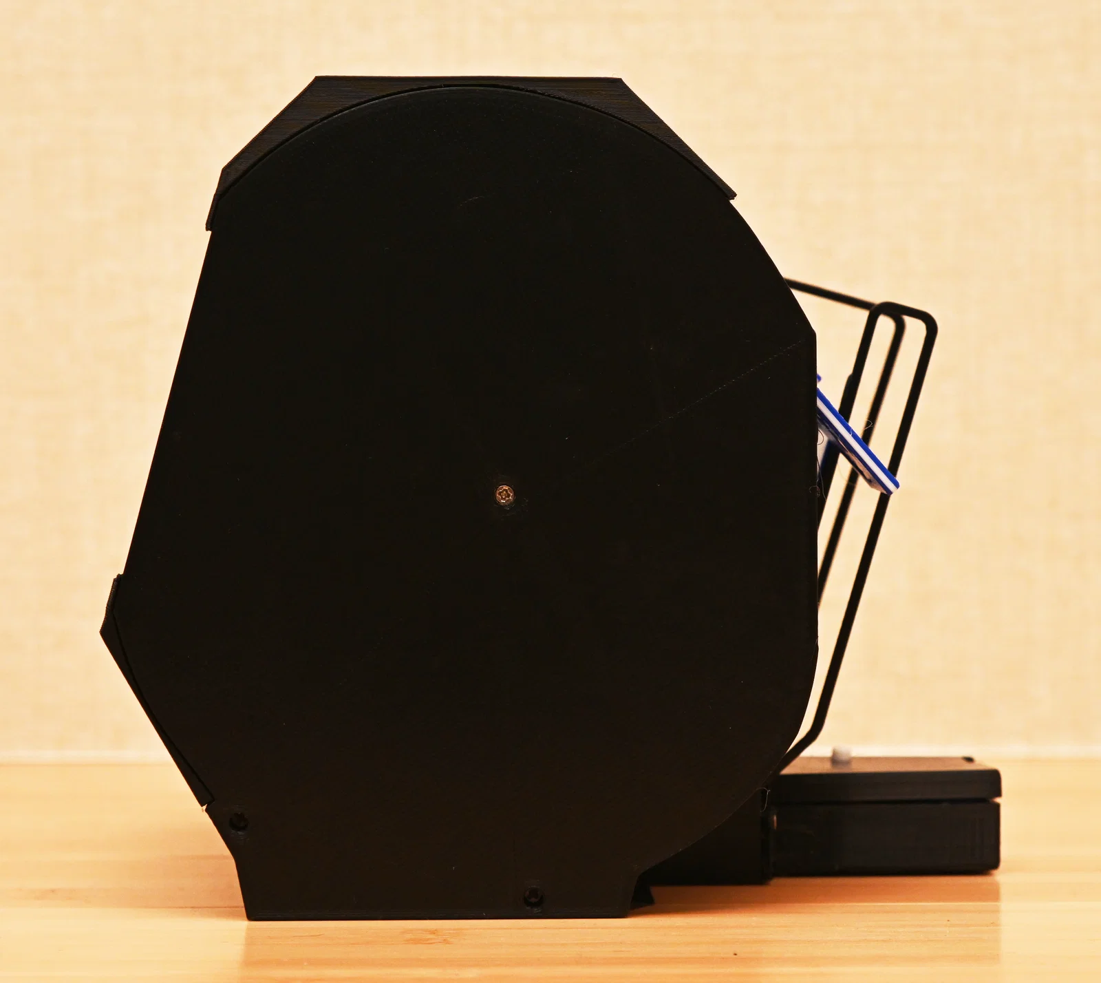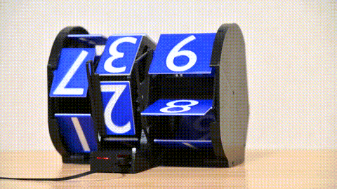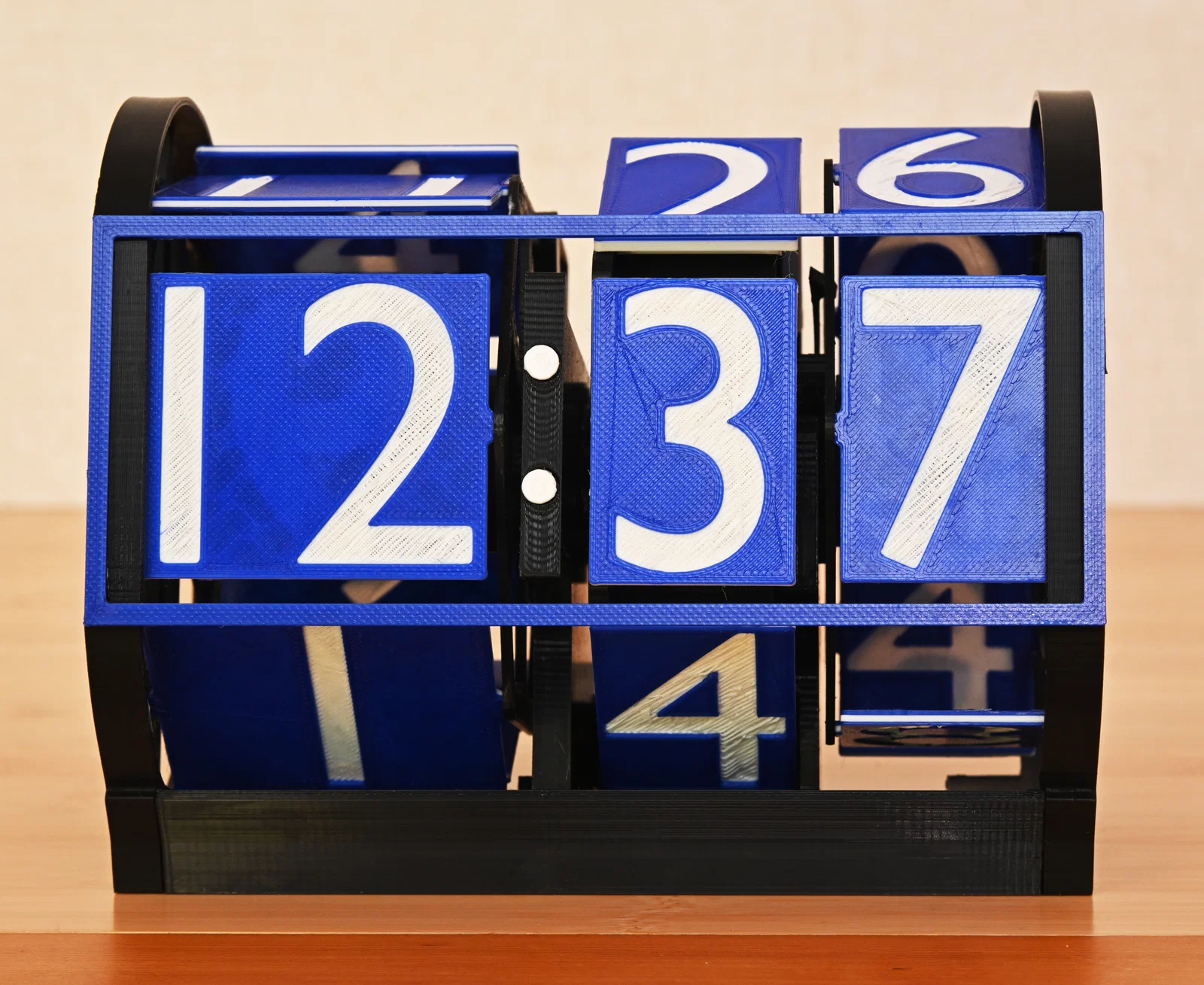 Mẫu Non-Split Flap Digital Clock dùng cơ cấu flip xoay mới để tránh đường tách của split-flap, cho mặt hiển thị lớn và nghiêng 15°. Motor nằm gọn trong bánh xe, tự canh mỗi phút, dễ chỉnh giờ, in được bằng máy 180×180mm và không cần support.