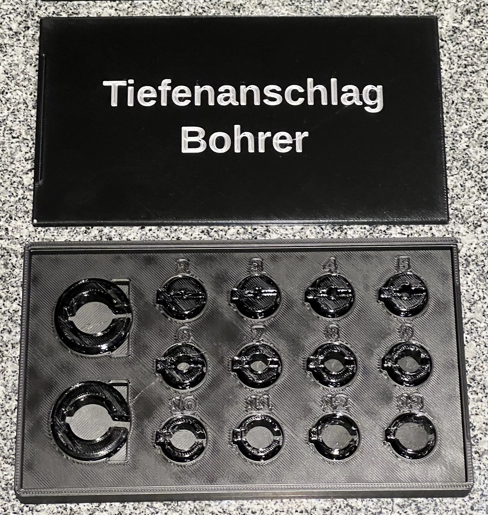 Bộ Drill Depth Stop theo mm và inch gồm holder và inlay (từ 2–13mm, 1,5–12,5mm và 1/16–1/2''). Kèm box nắp trượt chứa 2 holder + 12 inlay. Khuyến nghị in PETG 0.2mm cho phần chịu nhiệt.