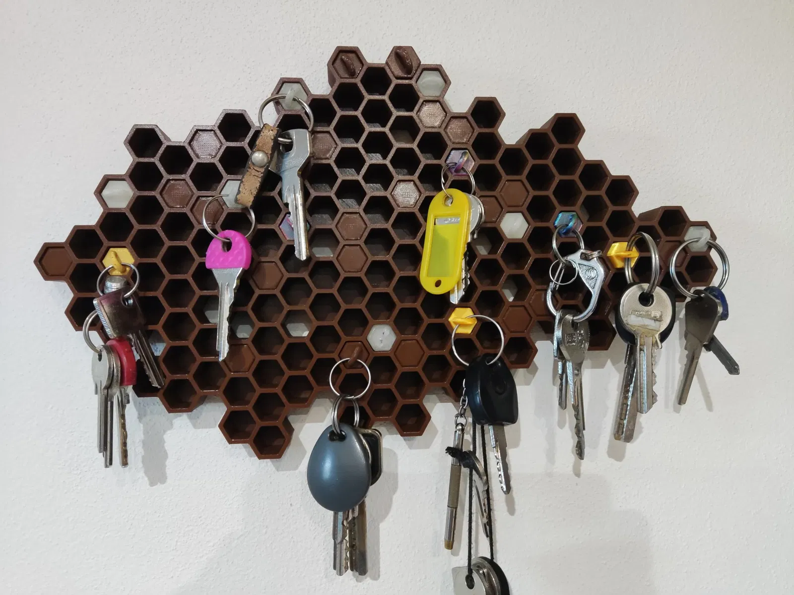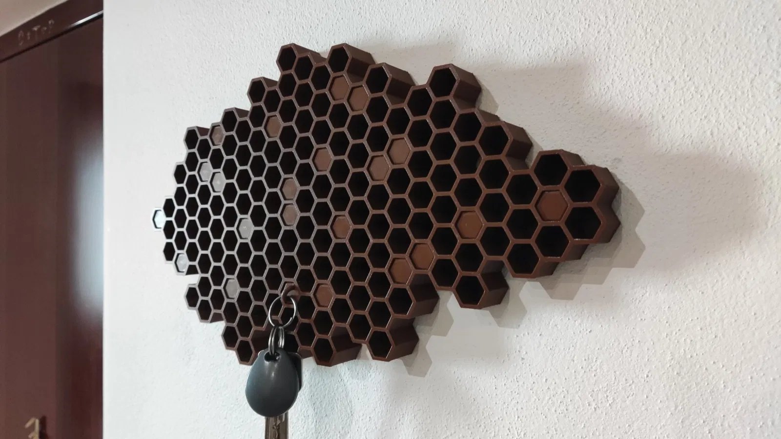 Tôi đang tìm kiếm một bộ tổ chức chìa khóa đẹp. Tôi đã tìm thấy một cái được thiết kế như tổ ong và tôi rất thích ý tưởng này. Bởi vì tôi muốn nó lớn hơn, với nhiều ô hơn, tôi đã quyết định tạo ra một công cụ giúp tôi thiết kế nó. Nếu bạn quan tâm, bạn có thể tìm thấy mã nguồn của nó trên GitHub.