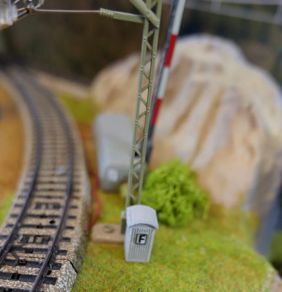 Bản remix Fernsprechbude cho mô hình đường sắt tỉ lệ H0: thu nhỏ kích thước, thêm ký hiệu “F”, và đặt mẫu nằm ngửa để dễ in đa màu cho bảng “F” khi in 3D.