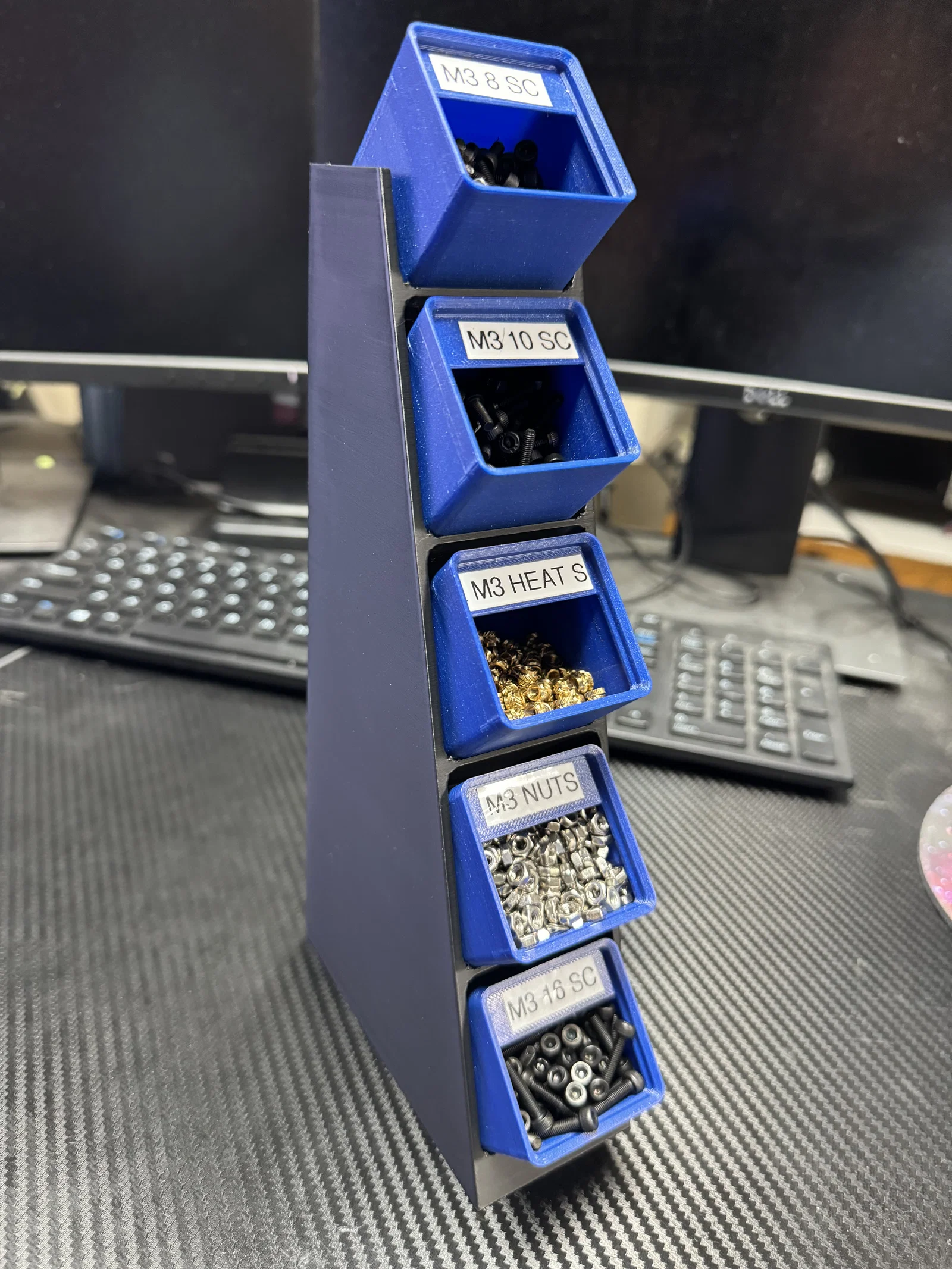 Đây là một giá đỡ cho 5 khay Gridfinity part bin dạng 1 đơn vị. Nó chiếm diện tích tương đương ba khay đặt ngang. Các khay được đặt nghiêng góc 45 độ, nhưng mình dùng với khay đầy vẫn thấy ổn, đa số linh kiện vẫn nằm yên không bị rớt. Mình làm phần hông gọn để bạn có thể dựng nhiều cái sát nhau.