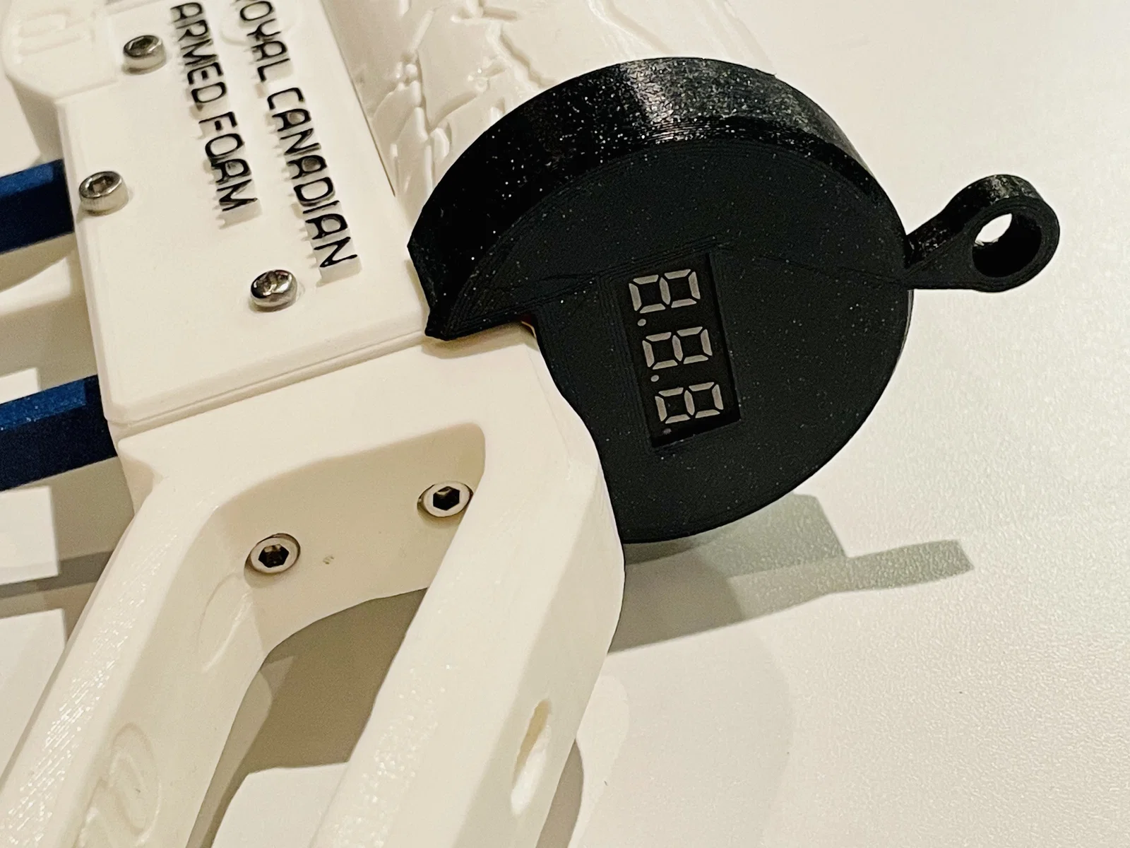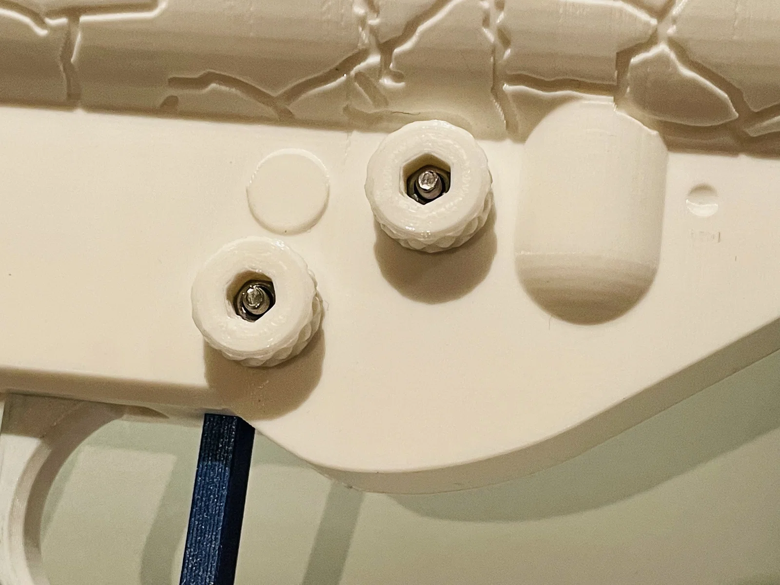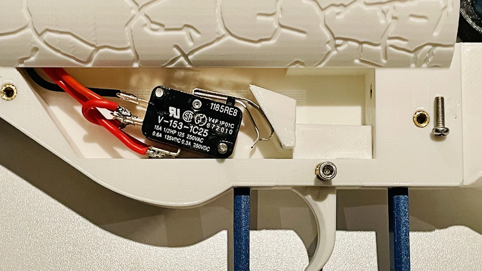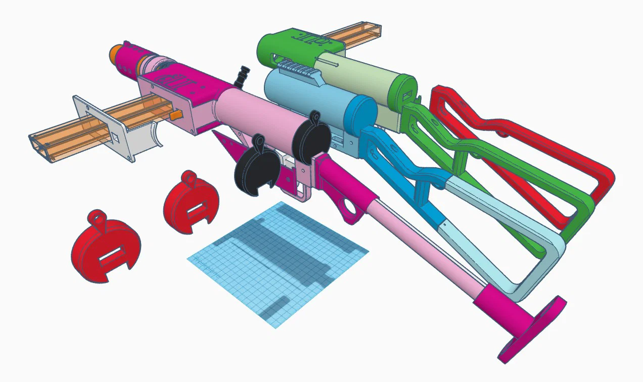 Có nhiều lựa chọn cho nắp pin (battery door) và báng (stock). Hai công tắc được gắn cạnh nhau và bạn sẽ cần bẻ/chỉnh các cần gạt (lever arms) một chút để chúng “click” lần lượt theo hành trình cò (trigger travel). Cò (trigger) dùng kiểu trục xoay giống springer thay vì trượt tới lui. Báng in thành hai nửa (có thể đổi màu) và được thiết kế để in theo hướng phẳng nhằm tăng độ bền, rồi dán lại theo chiều dài báng bạn thích. Mình có kèm hình hướng đặt để in (print orientation); khuyến nghị chặn support ở các lỗ nơi sẽ lắp ốc và heat inserts.