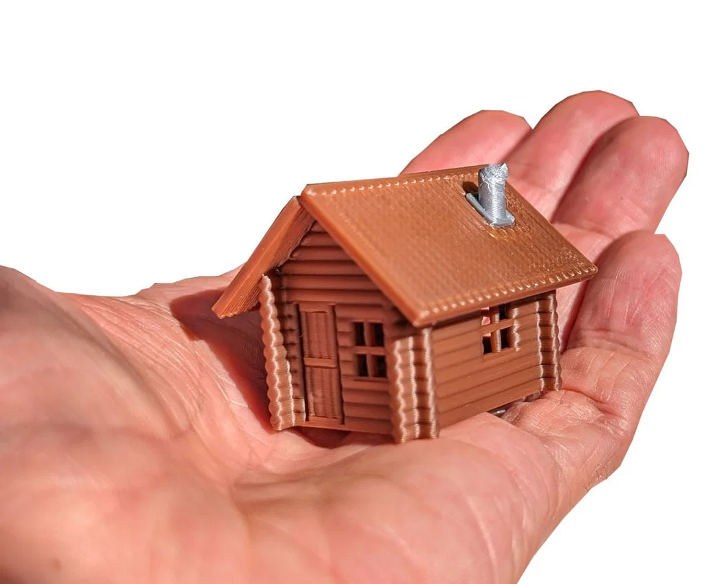 Mẫu “The tiny cabin (even more tiny)” là một cabin nhỏ xíu nhìn như gỗ, có thể in riêng cabin hoặc in kèm đế đá. Cabin cao 3,3 cm, thời gian in dưới 1 giờ (tuỳ máy). Sau in cần dán mái và ống khói.
