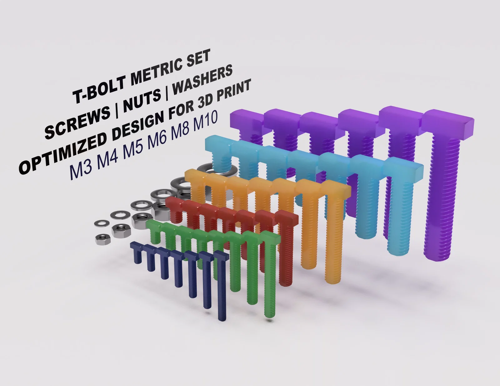 Bộ T-Bolt hệ metric M3–M10 phát triển từ vít đầu lục giác inox 18-8 (ISO 4017, DIN 933). Thiết kế in phẳng giúp bền hơn, dời seam khỏi vùng ren, in nhanh, không cần supports; dùng tốt với PLA/PETG.