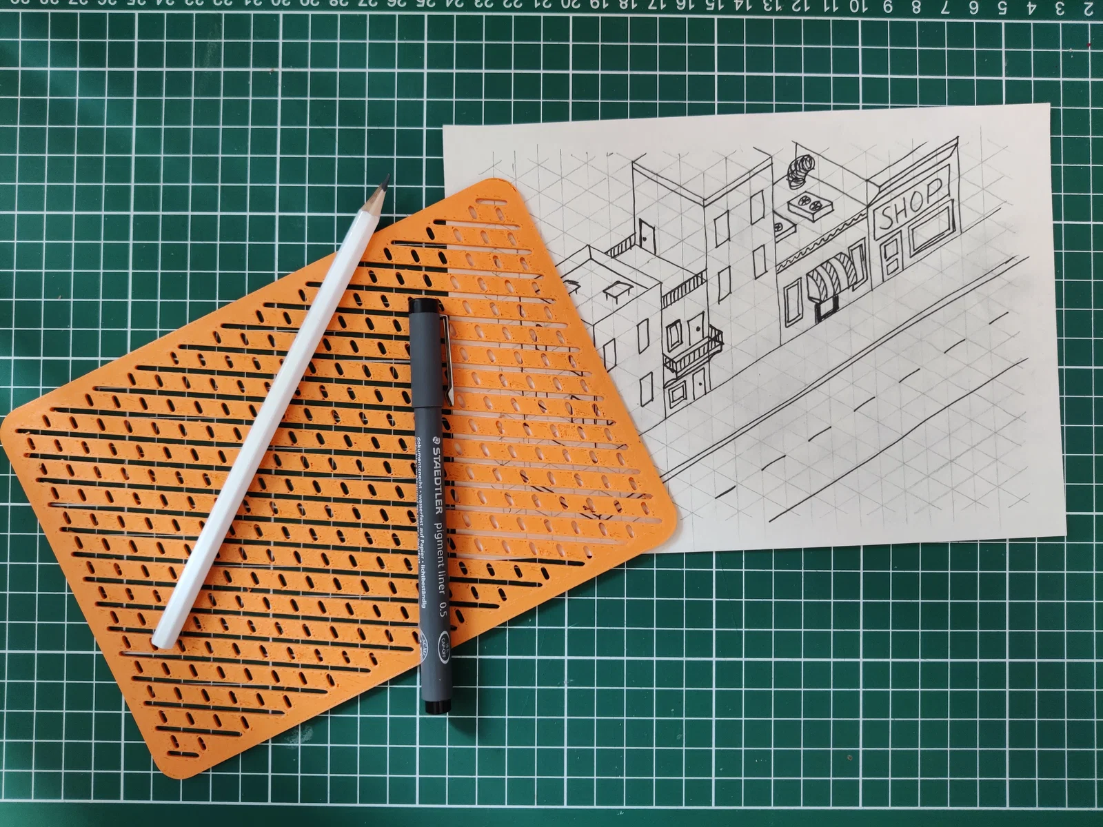 Template cỡ A5 giúp kẻ nhanh các đường perspective trong góc nhìn isometric khi vẽ trên giấy. Có thể scale 2x trong slicer để ra bản A4 hoặc in 2 bản rồi dán lại. Có thêm file STL bỏ lỗ nhỏ để in nhanh hơn.