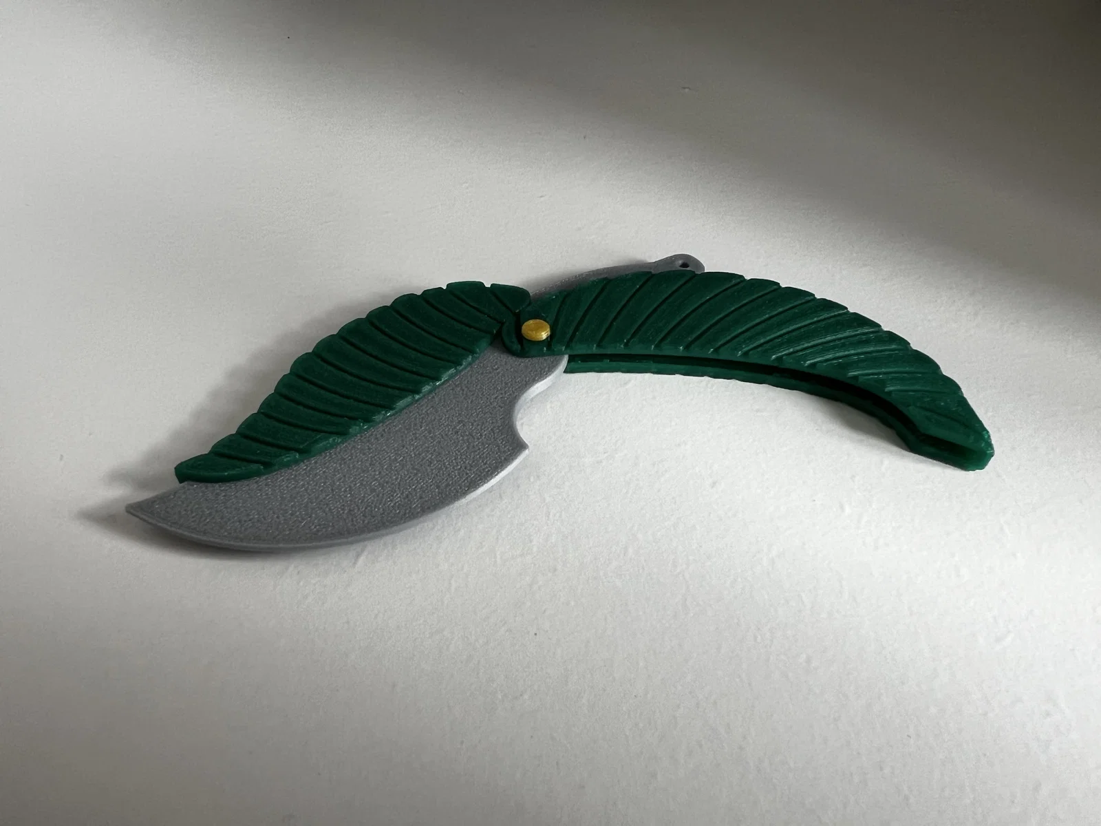 Mẫu dao gấp lấy cảm hứng từ hình ảnh bạn gái đưa, làm phụ kiện hợp cho nhân vật DnD. Khi in cần support bên trong phần ốp dạng lá; gỡ support và lắp ráp bằng keo, canh lỗ rồi đóng chốt hai bên.