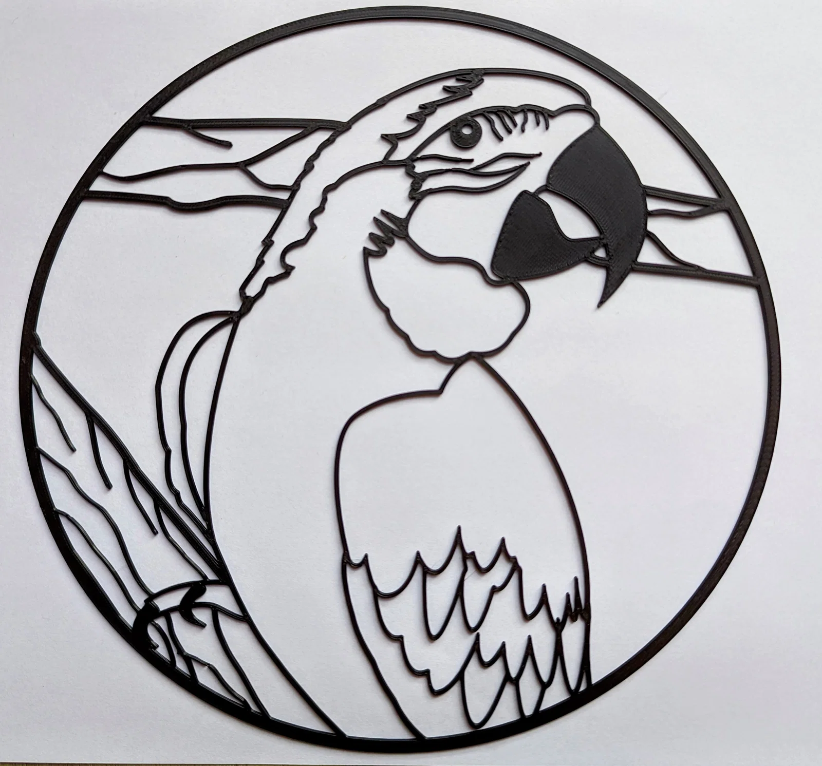 Line art của một chú vẹt macaw Blue-and-yellow đang đậu trên cành/cây. In ổn với nozzle 0.4. Nếu in kích thước nhỏ thì dùng nozzle mịn hơn có thể sẽ lợi hơn.