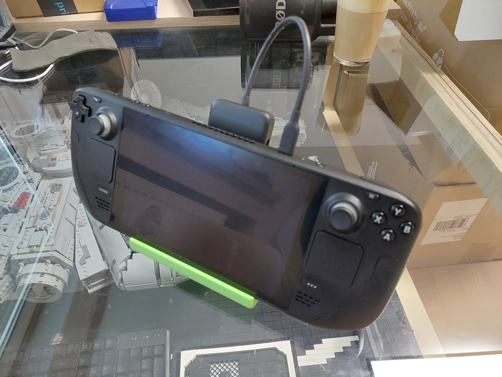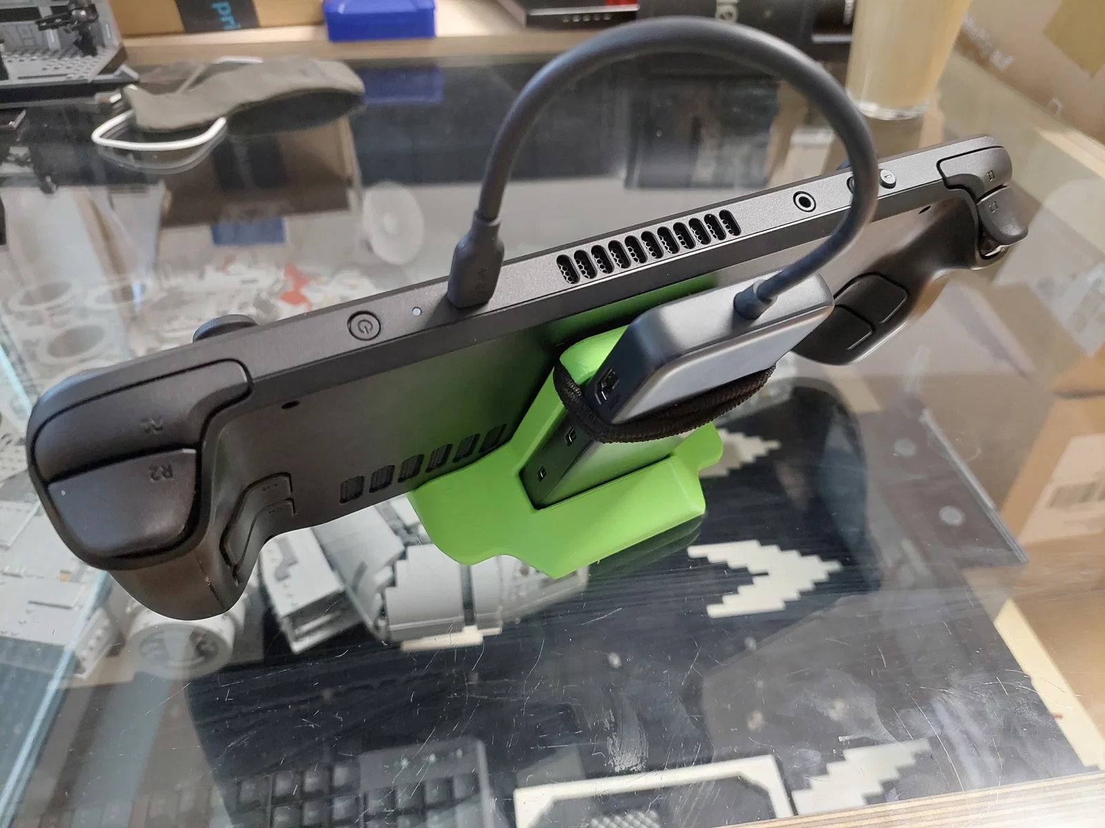 Kệ đỡ Steam Deck đơn giản có khe gắn Anker 8 in 1 USB-C hub. Dùng dây thun để cố định hub. Một số hub Anker dáng tương tự cũng có thể vừa. Kích thước hub tham chiếu: rộng 55 mm, dày 15.4 mm.