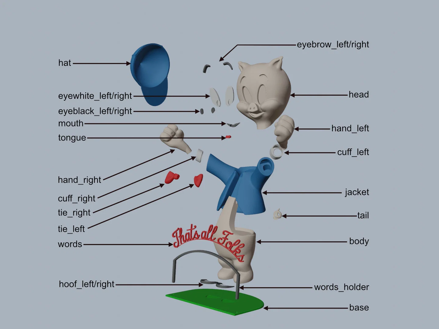 Porky Pig từ Looney Tunes/Merrie Melodies (Warner Bros.). Mô hình lắp ráp cao 245mm, chủ yếu in theo màu filament (PLA) nên không cần sơn. Phần head cần supports; kèm hướng dẫn màu, in và mẹo lắp ráp.