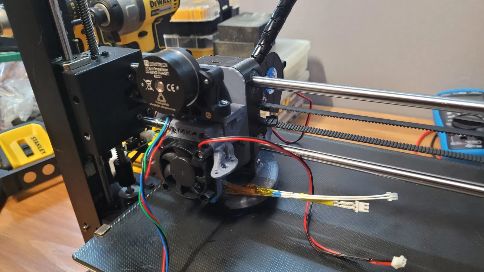 Cài đặt In tấm đế và tất cả các mảnh khác của X Carriage theo yêu cầu, chèn tất cả các chèn nhiệt. Gỡ bỏ đầu in cũ và lắp đặt X carriage theo hướng dẫn. Gỡ bỏ extruder cũ, khi máy tắt cắt bỏ phích cắm extruder cũ, lý tưởng là với một chút chiều dài thêm, trong trường hợp của tôi là 40mm nhưng bất cứ điều gì bạn có thể kết nối lại hoặc hàn đều đáng giá. Trên cáp đến từ bo mạch chính, hàn cẩn thận đảm bảo rằng heatshrink được đặt trên các dây của XH-4A hoặc phù hợp với bộ của bạn. Co lại heatshrink khi hoàn thành trên các kết nối. Lật ngược máy in, gỡ bỏ đáy và bắt đầu quá trình điều chỉnh động cơ bước E0 trên bo mạch 0. 0. 2 Trigolla. Nhiều video trên Youtube về điều này, chỉ cần rất cẩn thận vì máy sẽ cần được bật trong bước này. Hình ảnh được chụp từ video của JJ Shankles về điều này, tôi đã chọn 0. 52V trên máy của mình, một chiếc tua vít nhỏ và một đồng hồ vạn năng tốt là cần thiết cho việc này. Liên kết video của JJ Shankles. Khi điện áp được thiết lập và bạn hài lòng, tắt nguồn máy và lắp lại đáy. Lắp đặt tấm đế và hotend, hotend, tấm che và lắp đặt lên carriage trước khi lắp đặt Extruder là cách tốt nhất cho tôi. Kiểm tra chiều cao Z và đảm bảo rằng ống Capricorn từ hotend được chặt (Chắc chắn) vào đáy của extruder. Trong trường hợp của tôi, tôi đã chạy các dây và ống Bowden ngược khoảng ở giai đoạn này với một số công việc dọn dẹp nhanh chóng. Kết nối Extruder và khởi động máy. Nếu chạy Klipper, tôi có một cấu hình cơ bản trong GIT của tôi, nếu chạy Marlin bạn có thể phải kiểm tra hướng extruder và có thể hoán đổi một số chân để đảo ngược hướng. Bây giờ bạn đã hoàn tất cài đặt, PID, Esteps (Khoảng cách xoay) và những thứ tương tự sẽ cần thiết nhưng hãy kiểm tra chiều cao Z trước khi làm bất cứ điều gì khác vì nó có thể bây giờ hơi khác một chút. Trong slicer, tôi đã phải thay đổi chiều cao Z tối đa thành 170 nhưng bạn có thể có thể đẩy một chút hơn.