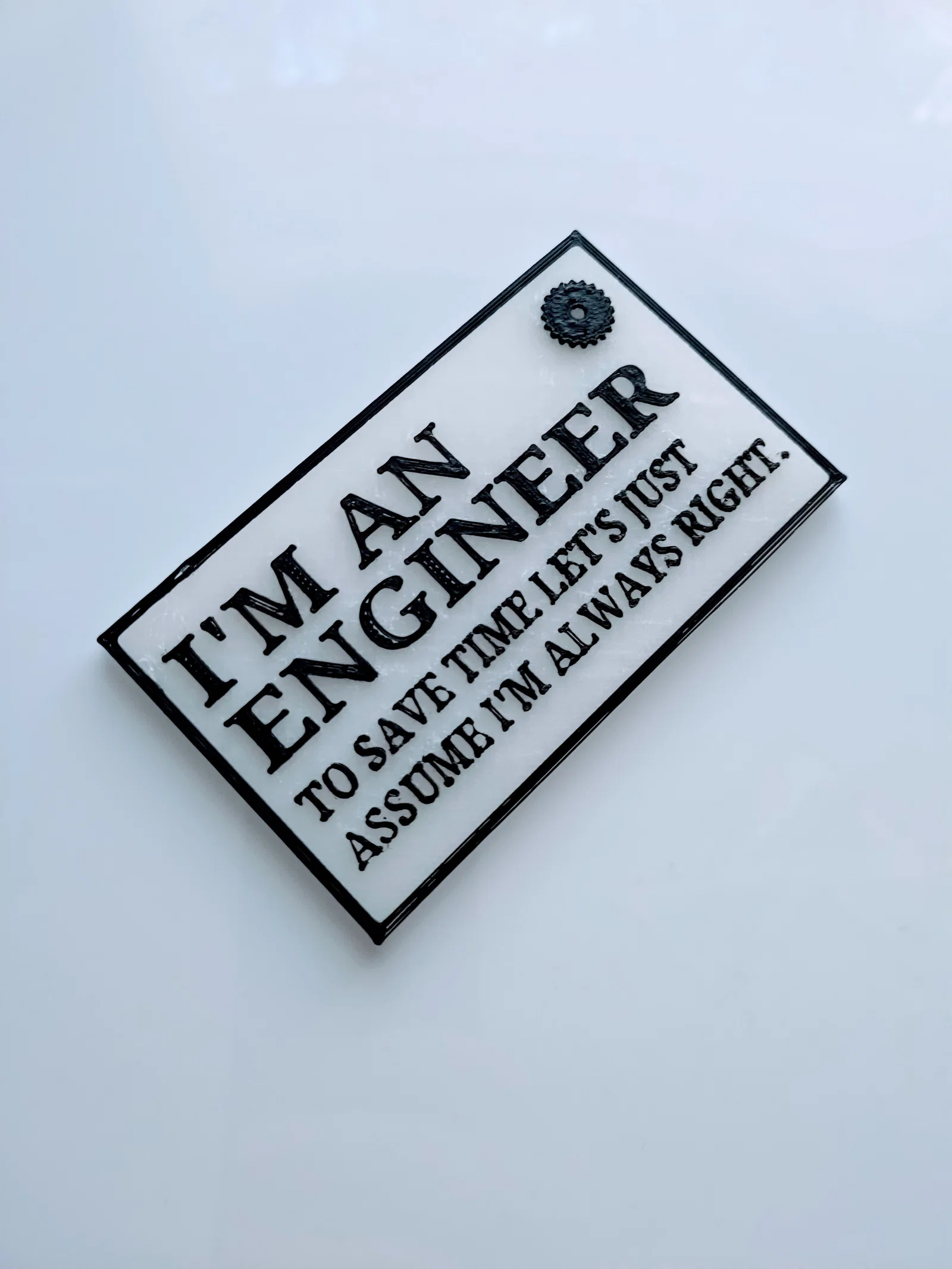 Bạn là kỹ sư và muốn thể hiện phong cách hài hước tại nơi làm việc? Hãy in ngay bảng hiệu 'I'm an engineer' cực chất này để trang trí góc bàn của mình. Với thiết kế chữ nổi tinh tế và kích thước tối ưu, bạn có thể dễ dàng in bằng máy in 3D gia đình với nhựa PLA. Dù bạn chọn cách in đa màu hay tự sơn thủ công, chiếc bảng này vẫn đảm bảo sự sắc nét và tính thẩm mỹ cao. Đây là một phụ kiện để bàn vô cùng sáng tạo, đồng thời là món quà ý nghĩa và vui nhộn dành tặng cho những người bạn cùng ngành kỹ thuật của bạn. Đừng bỏ lỡ mẫu thiết kế đơn giản mà ấn tượng này để làm mới không gian làm việc của mình ngay hôm nay nhé!
