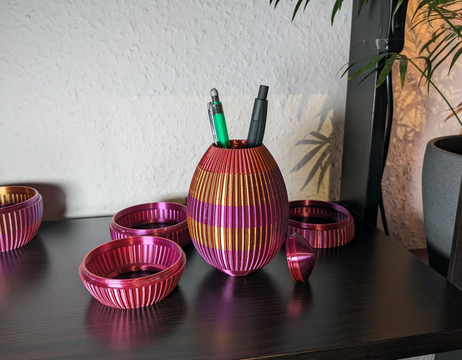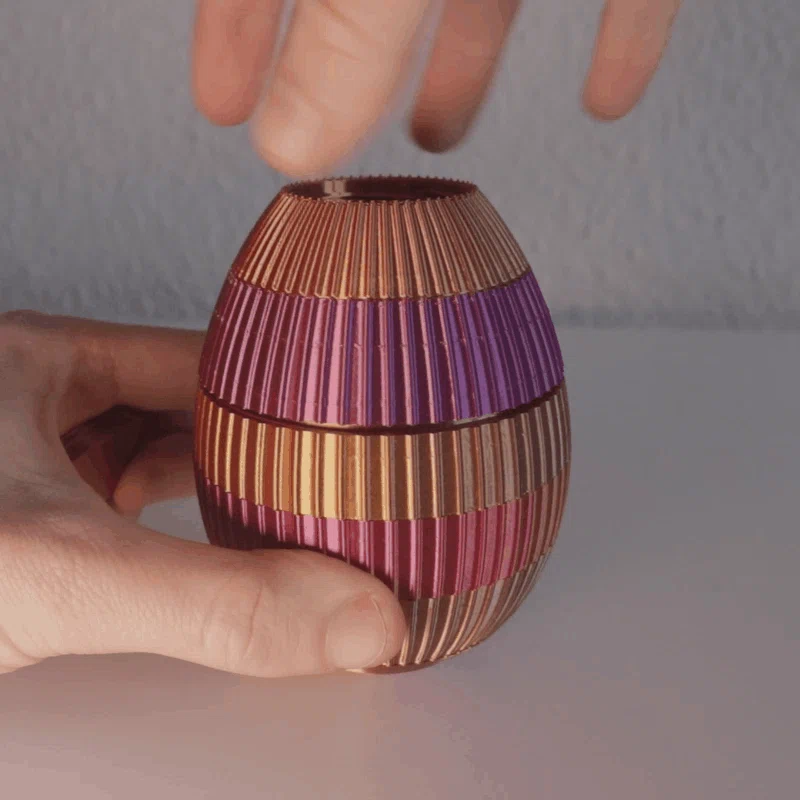 Mẫu trứng Phục Sinh dạng ren vặn, gồm nhiều mảnh ghép lại để tạo khoang rỗng. Dùng làm đồ trang trí, đồ chơi, ống cắm bút hoặc hộp đựng kẹo/quà nhỏ dịp Easter. Khuyên dùng Arachne walls để in đẹp hơn.