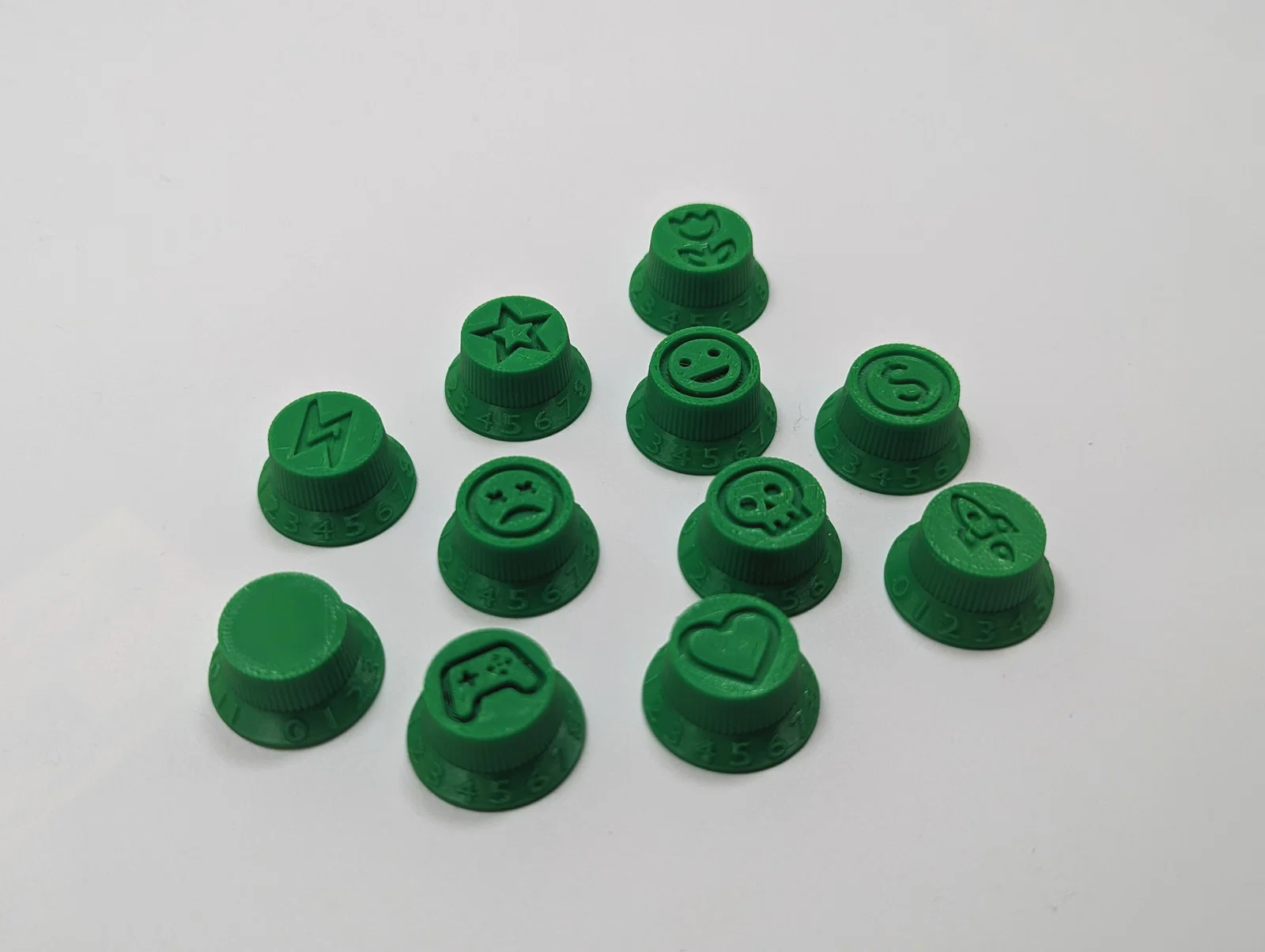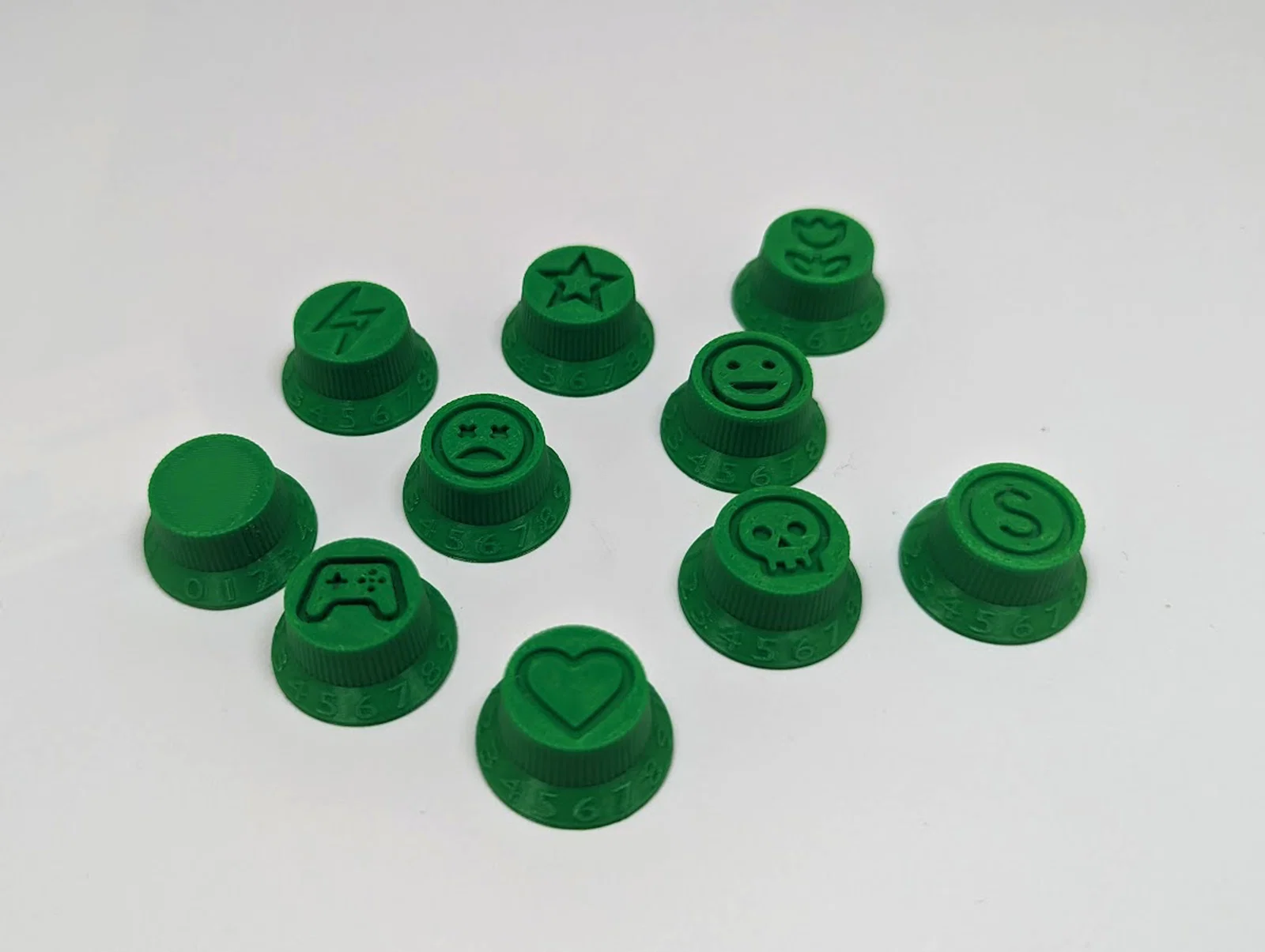 Bộ sưu tập 11 núm vặn (knob) guitar có đánh số, và con số thật sự lên tới 11. Tải STL từng mẫu hoặc 1 file 3mf gồm đủ 11 thiết kế: trơn, sao, đầu lâu, tên lửa, tay cầm game, mặt cười, tia sét, mệt xỉu, tim, tiền, hoa.