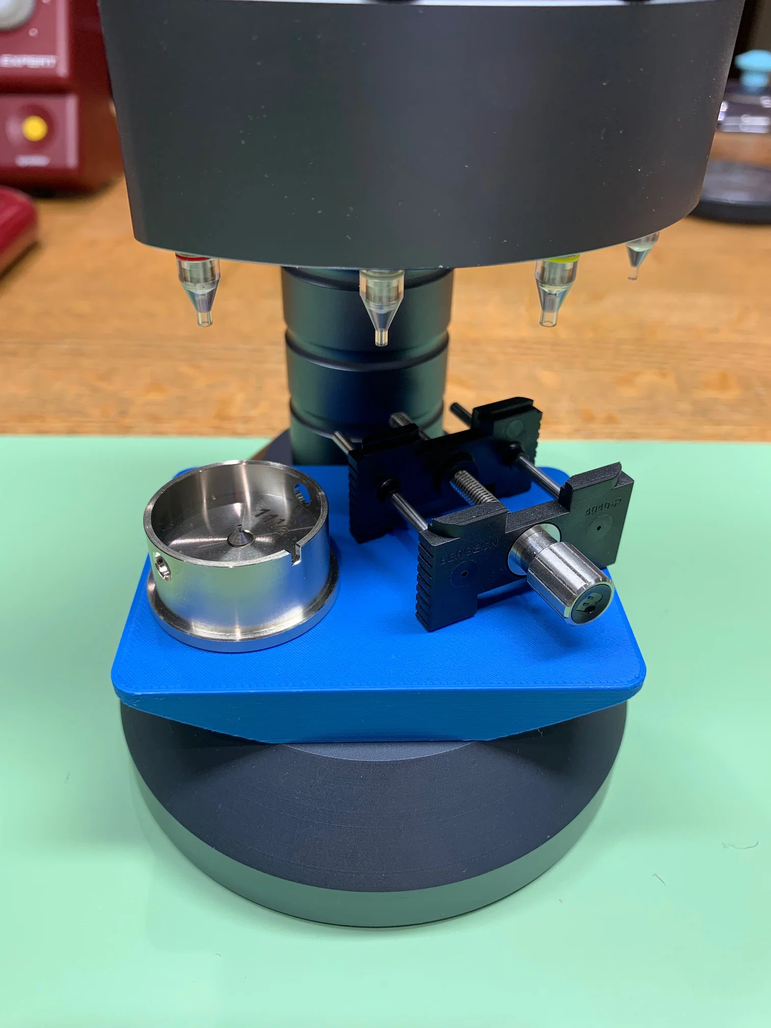 Platform gắn lên đế hand-setting press, fit Bergeon 8935 và các máy kiểu BG8935 (RUIPAI/JIATIMES). Tạo mặt phẳng rộng, chắc, chừa khoảng cho movement holder; rất tiện khi lắp kim sub-dial lệch tâm.