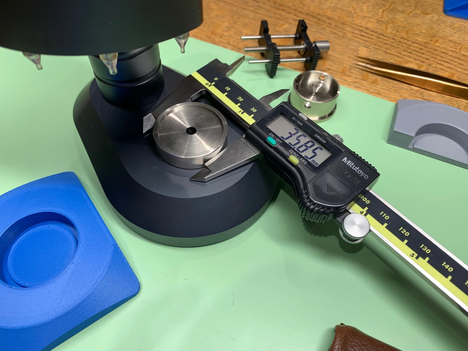 Do dung sai khá sát, có kèm nhiều phiên bản với đường kính recess khác nhau. Mình thấy kết quả tốt nhất là chọn model có đường kính lớn hơn 0.20mm so với đường kính thực tế đo được. Với Bergeon 8935 đã test, mình đo đường kính 36.15mm (chọn bản 36.35mm). Với các tool không phải Bergeon đã test, mình đo trong khoảng 34.45mm đến 35.9mm (lần lượt chọn bản 34.65mm và 36.1mm). Đây là hình chụp phần đế đo được 35.85mm bằng thước cặp của mình. Model đường kính 36.05mm lắp rất vừa trên cái này, cảm giác tháo/lắp nhẹ nhàng và không bị lắc ngang.