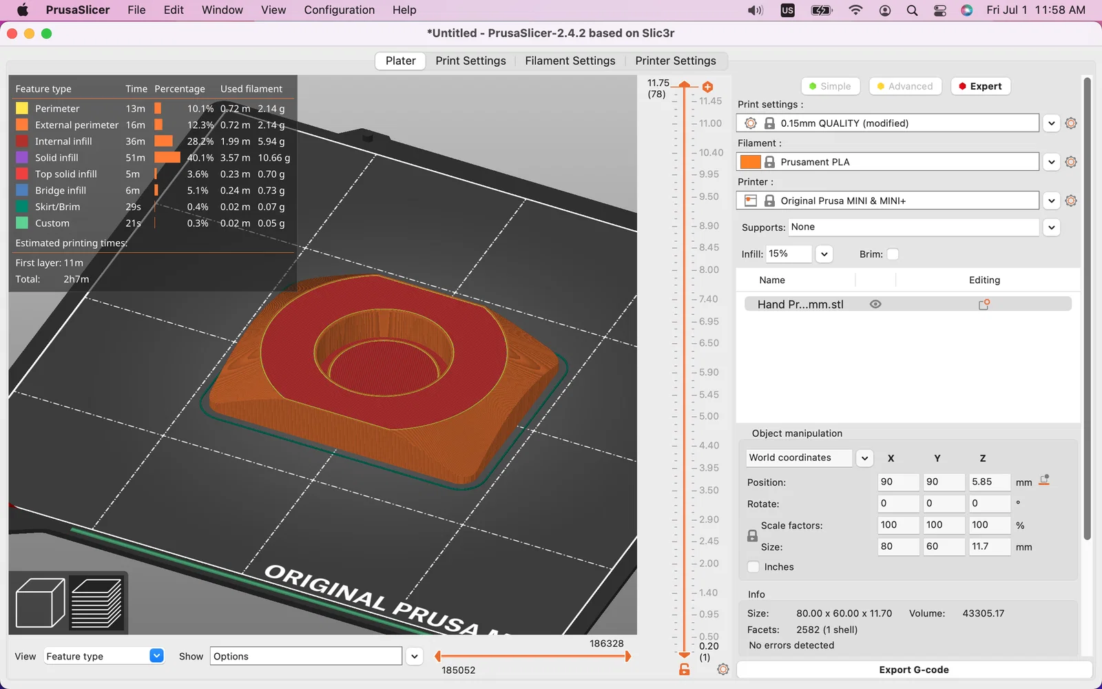Model này dễ in và đã được test trên Prusa i3 MK3S+ và Mini+ với nozzle 0.4mm ở layer height 0.15mm và 0.20mm. Các bản test in trên smooth và satin sheet (mình thích bề mặt satin hơn). Với model này, mình thích bật “External perimeters first” để đảm bảo kích thước. Các góc bản in nên ít hoặc hầu như không bị nhấc khỏi printbed; nếu gặp hiện tượng này, mình khuyên dùng gluestick hoặc hạ Z-level để tăng độ bám.