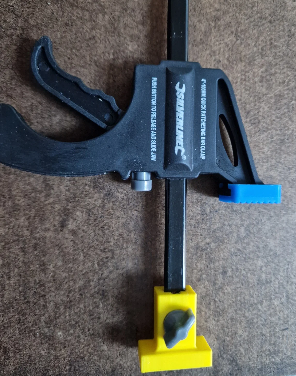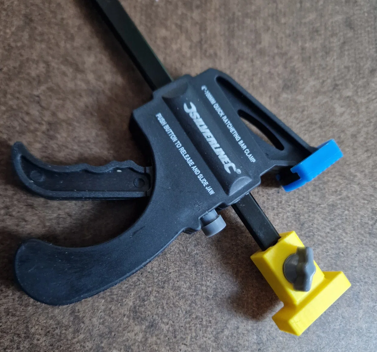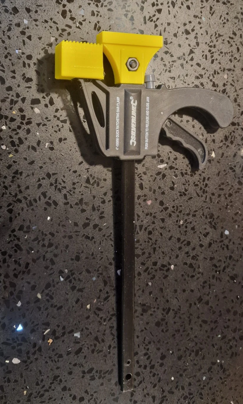 Adapter dùng kẹp 100mm ratchet bar quick grip mini light duty clamp để kẹp chặt ray LIDL Parkside vào phôi. Bản Updated (V2) gia cường hai bên và có pad 10mm thay thế để bỏ giới hạn khoảng kẹp tối thiểu.