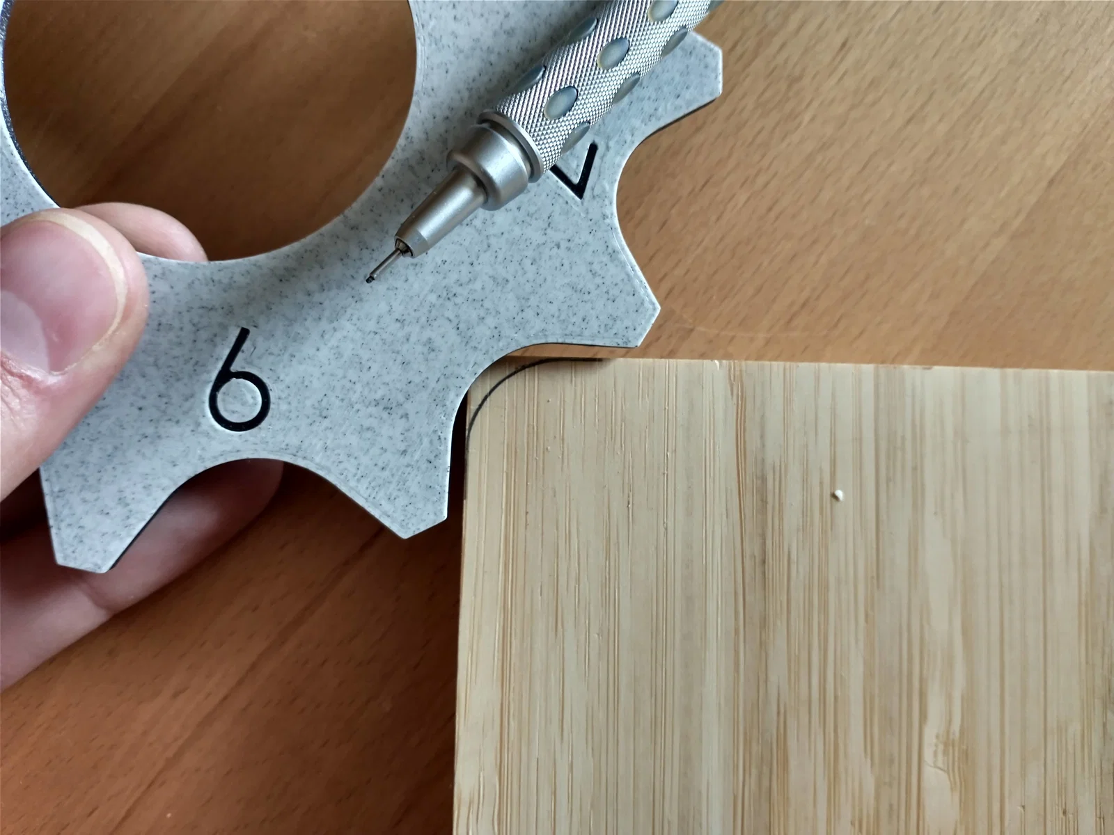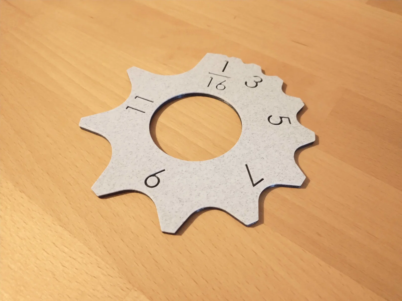 Cái template này đủ dày để hỗ trợ kẻ (layout) các đường bo góc (radius) trên những góc vuông, để sau đó chà nhám, dũa, hoặc cắt. Ngoài ra cũng có thể dùng để bố trí thiết kế trên giấy. Các mức tăng bắt đầu từ 1/16 inch và tăng dần theo từng 1/16 cho tới radius 3/4 inch. Cũng có thể dùng để “reverse-engineer” bán kính bo của một chi tiết bằng cách áp vào biên dạng và chọn mức khớp nhất (best-fit).