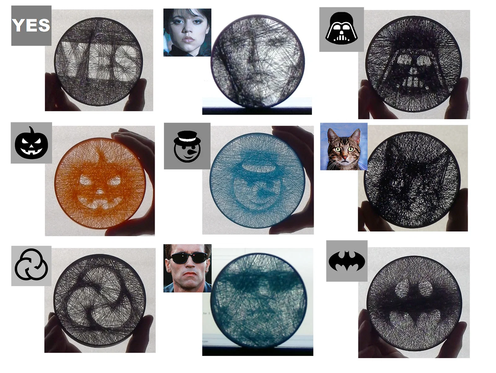 Bộ 14 mẫu string art dạng vòng với “sợi” tạo thành hình ảnh. Tối ưu cho máy in FDM (PLA), gợi ý cài đặt: layer 0.2 mm, first layer 0.3 mm, nozzle 0.4 mm, 50–60 mm/s; kích thước vòng khoảng 120 mm.