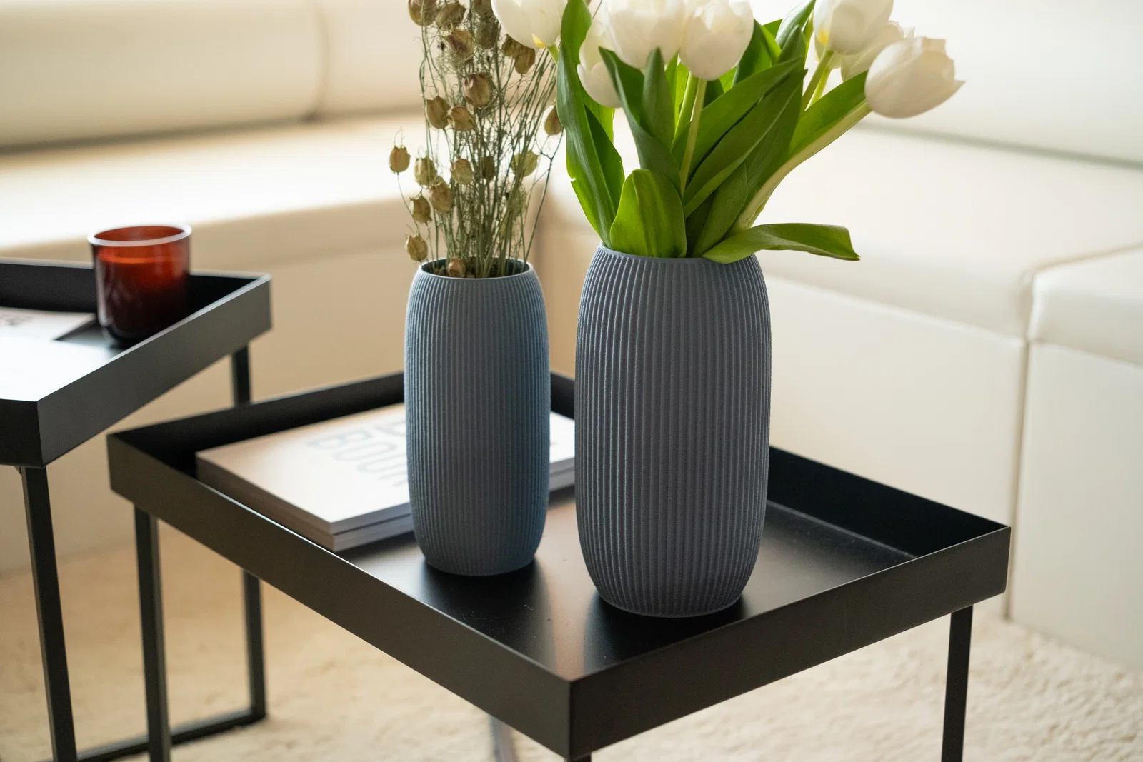 Bình hoa in 3D phong cách hiện đại với họa tiết gân nổi chạy toàn thân, tạo hiệu ứng ánh sáng–bóng đổ bắt mắt. Có 2 kích thước 220mm và 250mm, khuyến nghị in Vasemode, nozzle 0.6, layer 0.4mm và bật fuzzy mode.
