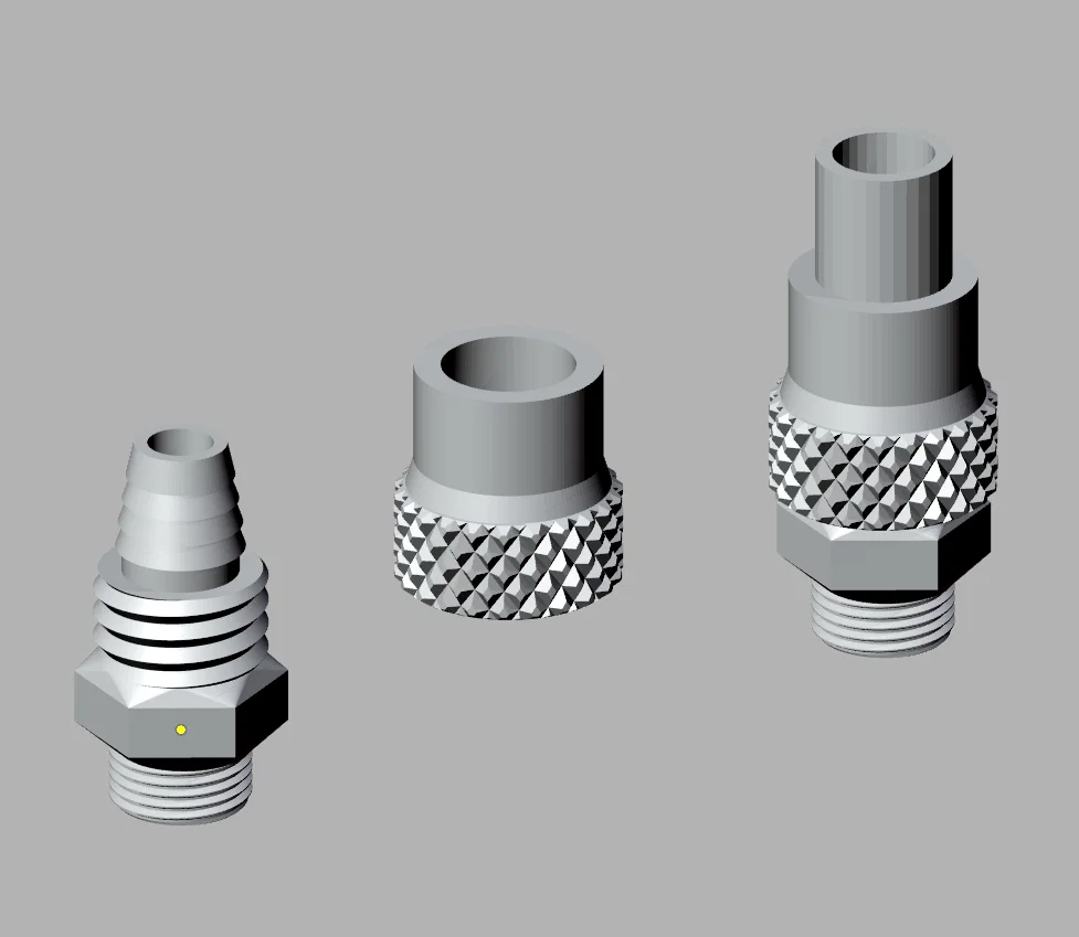 2021-02-27: Bản thử đầu của mình dùng được, làm cho vòi xài lại được, nhưng vẫn rò nhẹ, nên mình làm các gờ (barbs) của miếng end to hơn một chút, thuôn (taper) từ vị trí ở bản nháp đầu tiên lên đến lớn hơn khoảng 3 mm đường kính tại khu vực ren của clamp. Ngoài ra mình thêm phần lục giác 1⅜ inch để có chỗ cho mỏ lết bám vào khi siết lock nut. Bộ phận mới giờ đã kín nước.
