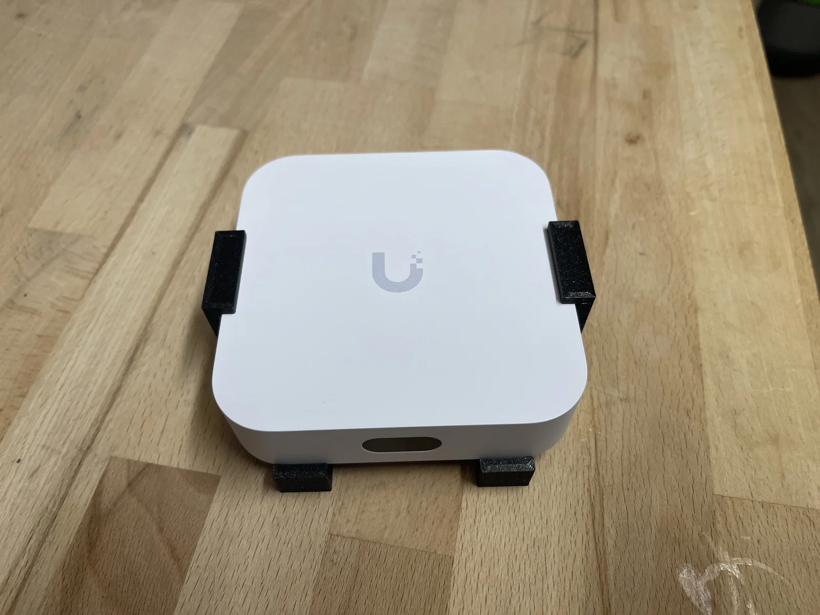 Beslaget som låser Ubiquiti UniFi UX Express fast, dog ikke mere end det nemt kan klikkes ud igen, og samtidig er det muligt at skifte kabler med en hånd.