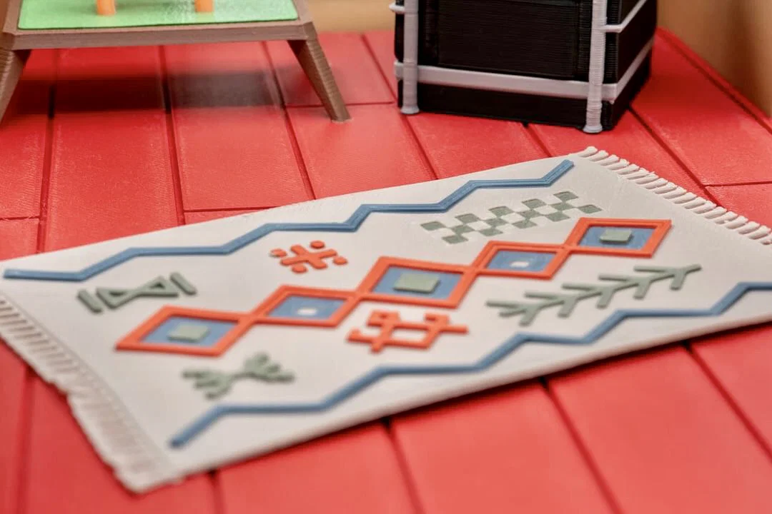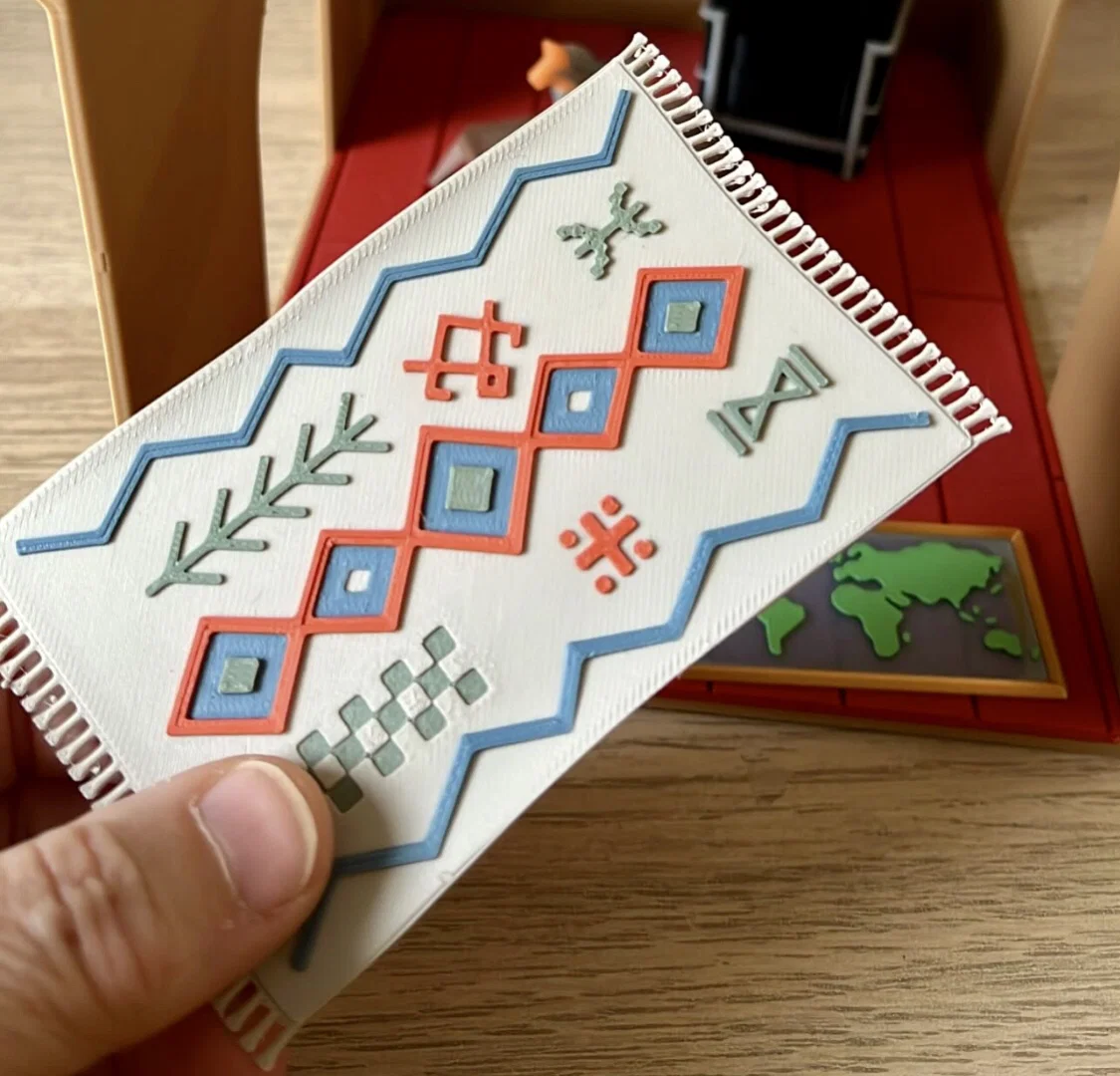 Mô hình thảm dệt Amazigh (Berber) đại diện Bắc Phi trong phòng chủ đề du lịch của biệt thự thu nhỏ @skip_per07. Thiết kế tối ưu để in 3D, không cần supports; có thể lên màu bằng pause đổi filament hoặc MMU/AMS.