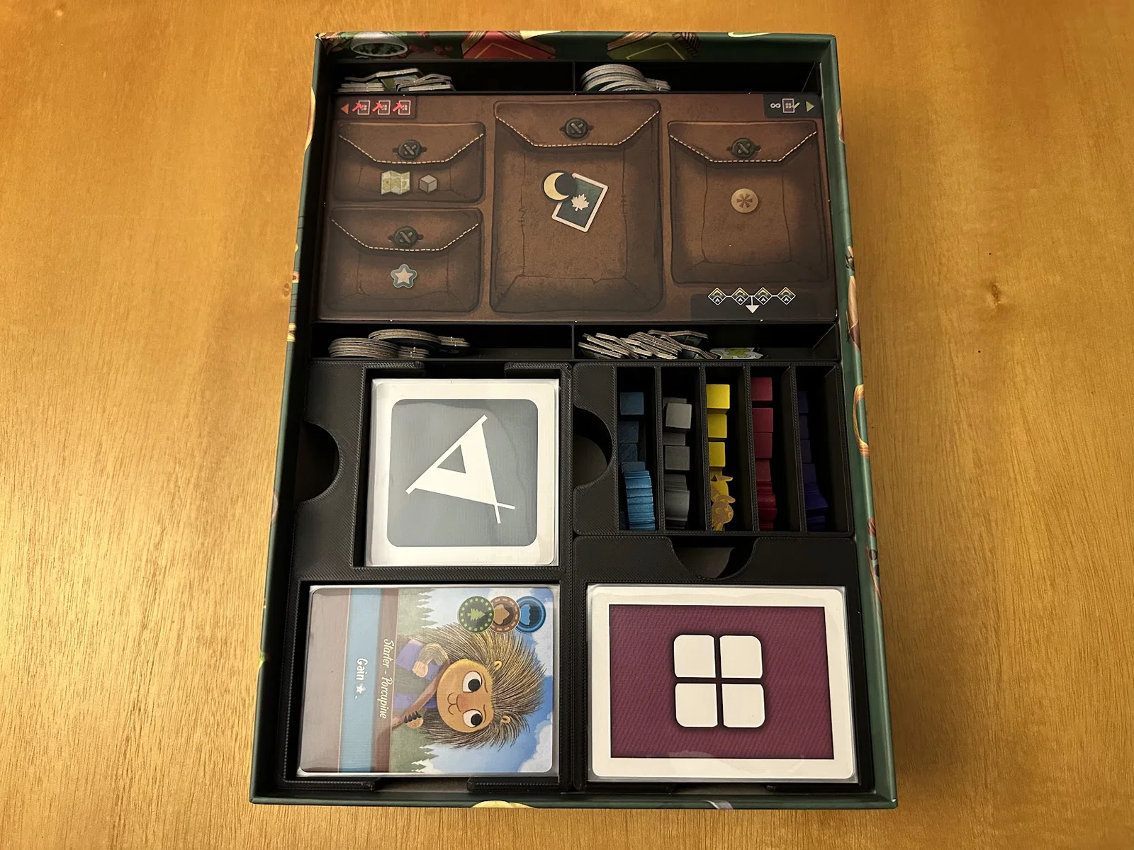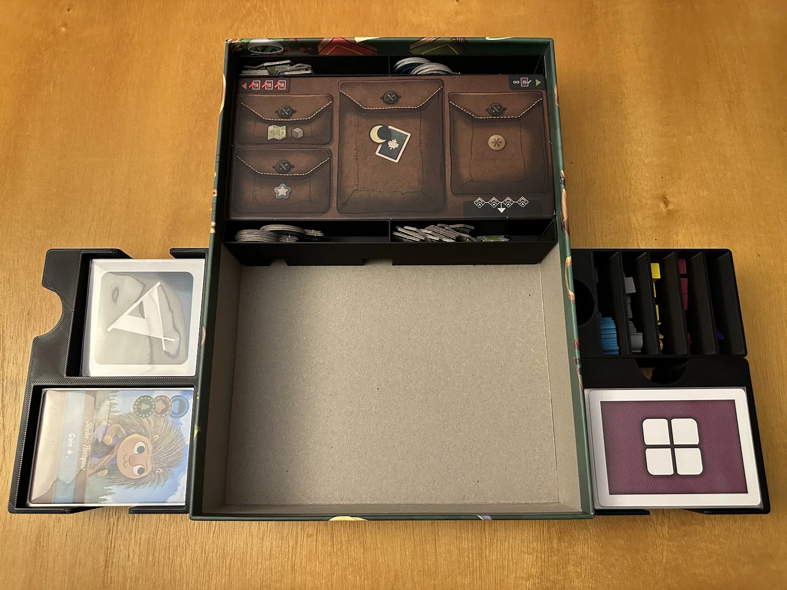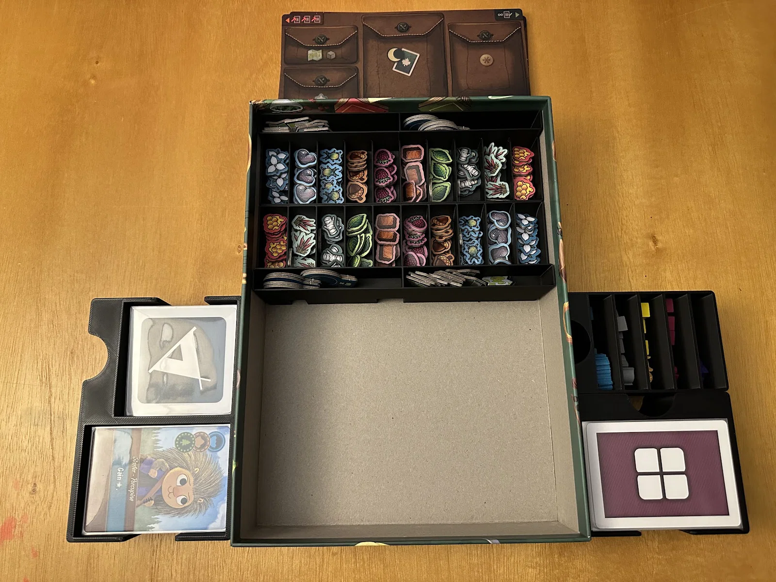 Đây là bộ insert cho Maple Valley, một game Creature Comforts xoay quanh việc chuẩn bị cho Lễ hội Mùa Xuân lớn. Game có khá nhiều token tài nguyên và thẻ bài, nên insert này nhằm giúp lấy mọi thứ ra khỏi hộp nhanh, và setup với ít công sức nhất. Các khay được in với nozzle 0.4mm, layer height 0.2mm, và 15% infill. Thẻ của mình có bọc sleeve SleeveKings, ~60 microns, nhưng các khay vẫn sẽ phù hợp với sleeve dày hơn.