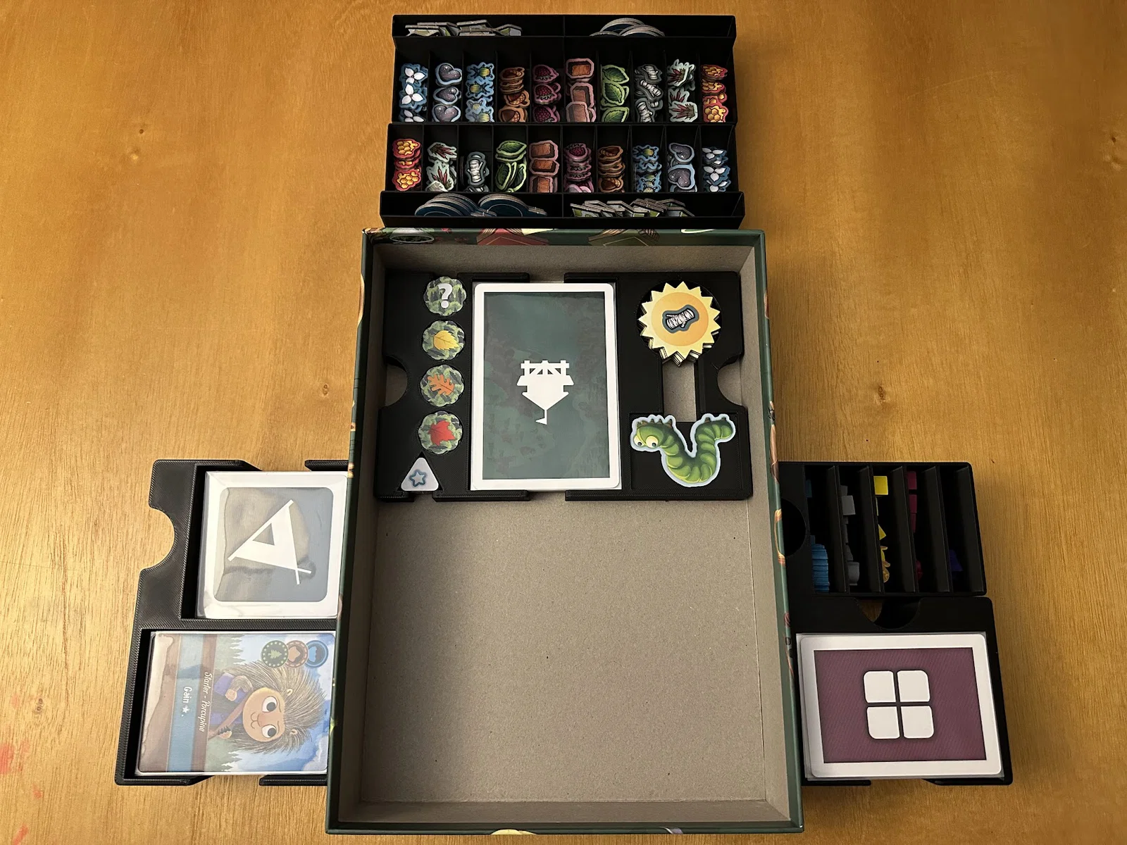 Bộ insert cho Maple Valley (bản retail) giúp sắp xếp token tài nguyên và thẻ gọn gàng, lấy ra nhanh và setup nhẹ công. In thử nghiệm với nozzle 0.4mm, layer 0.2mm, 15% infill; hỗ trợ thẻ có sleeve.