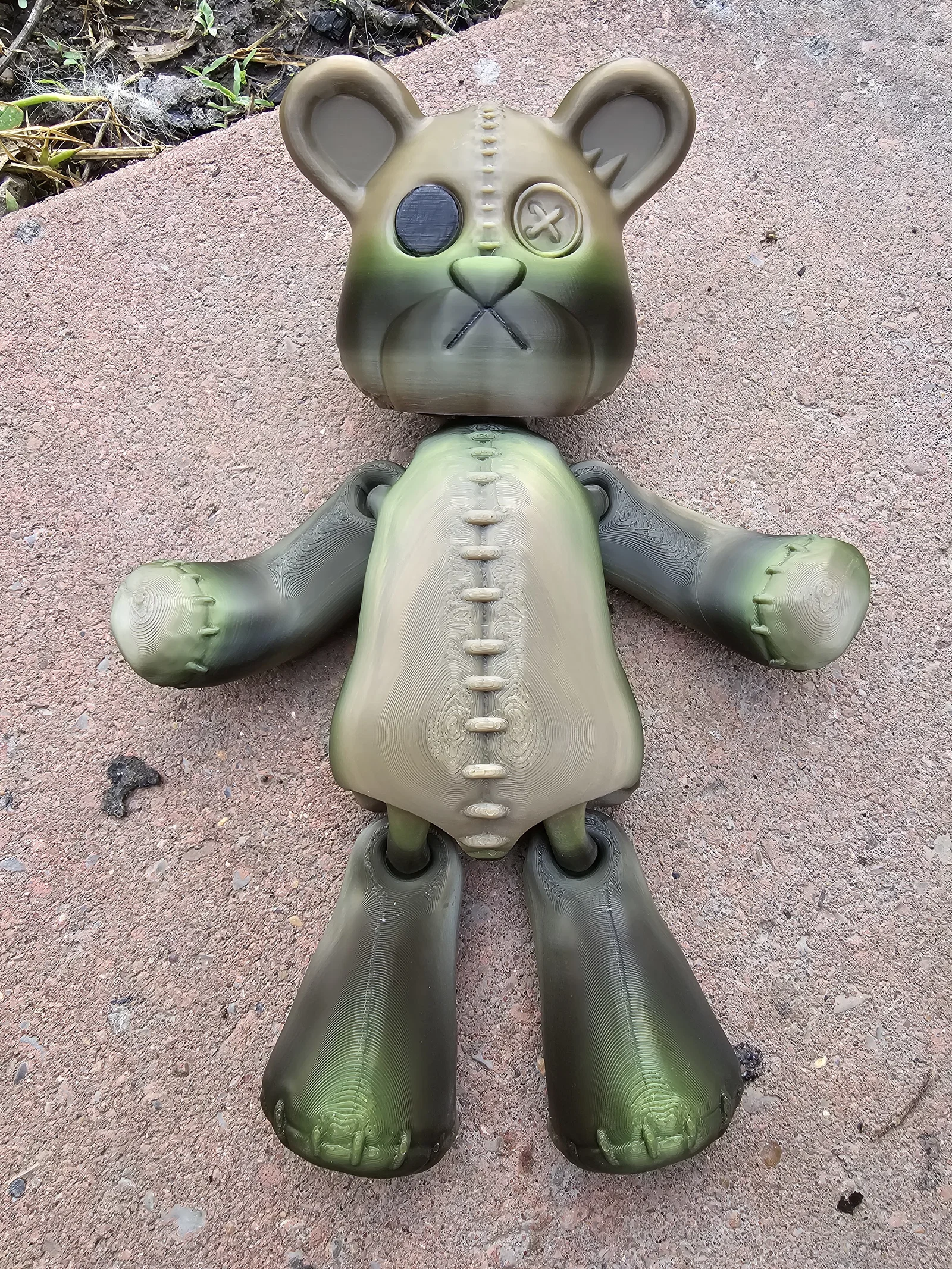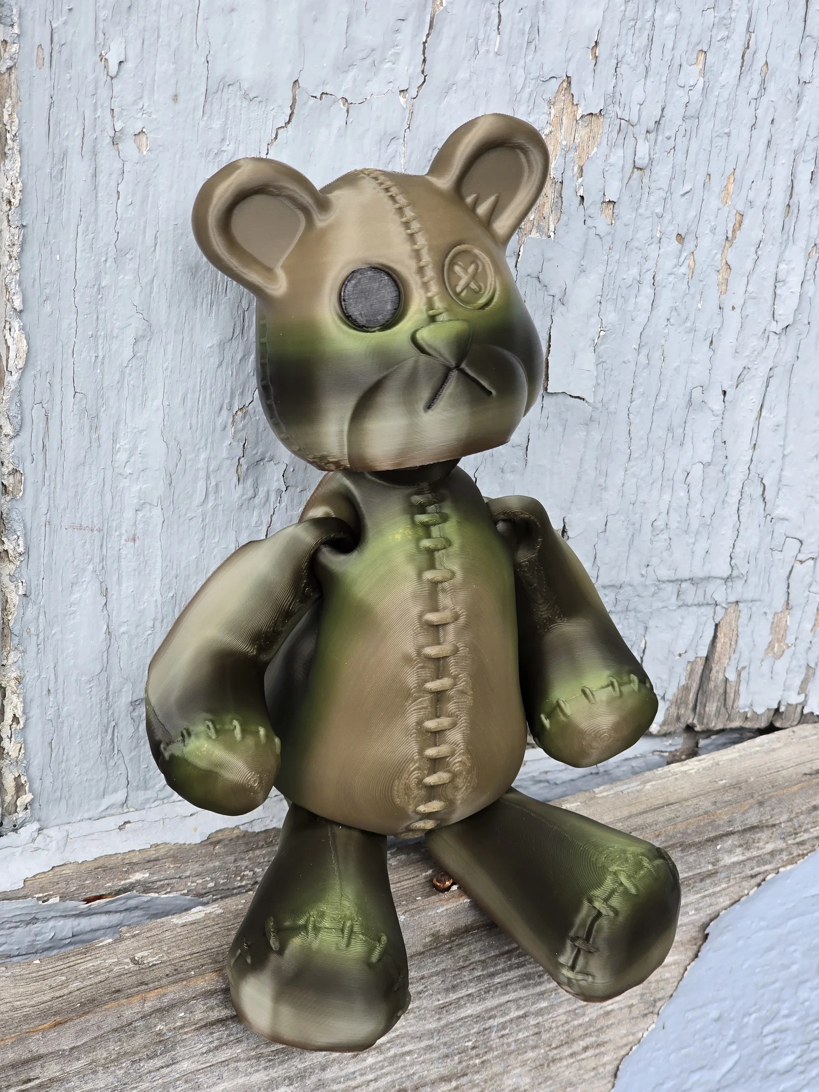 Stitches là gấu teddy phong cách emo dễ thương, có thể ngồi thẳng và vung tay xuống hai bên. Mẫu có đầu rời gắn ball joint, fit khá khít; khuyên in 0.16mm, 3 walls, infill ≥10% để khớp chắc.