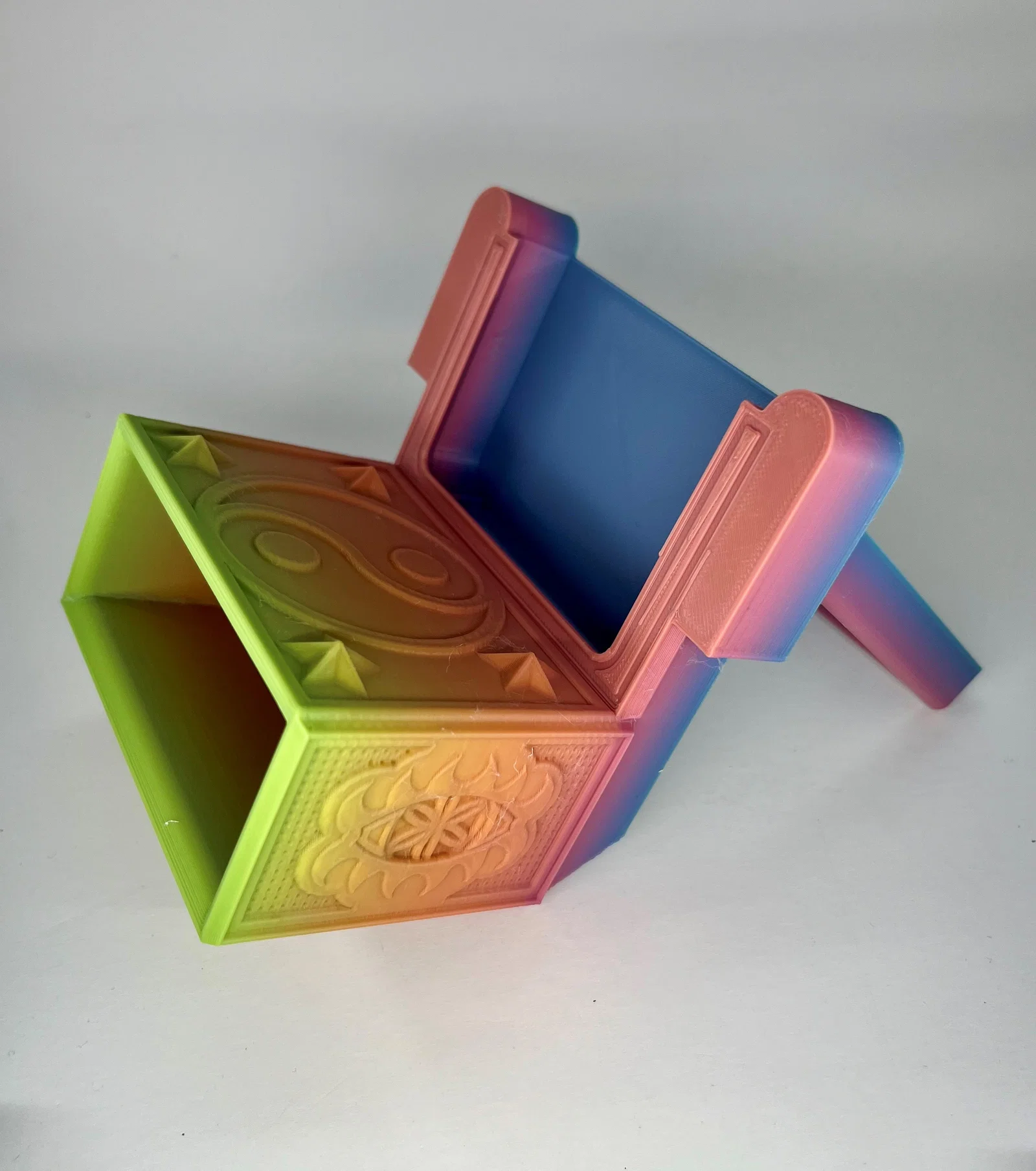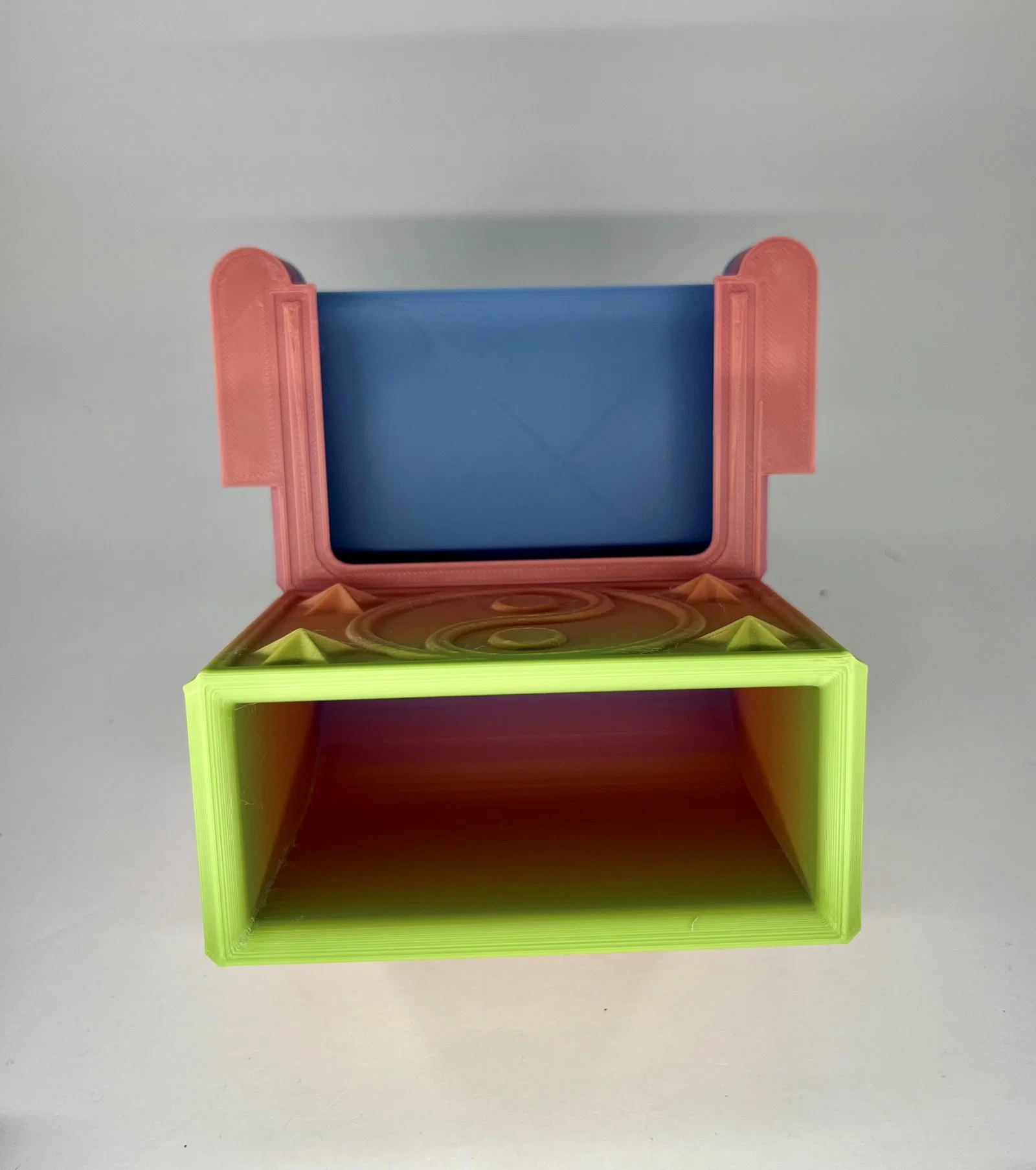 Acoustic phone amplifier kiểu trippy, print-in-place không cần lắp ráp. Có chân chống gập để hướng âm tốt hơn, không cần pin hay cắm điện. Thiết kế theo iPhone 13 + Otterbox nhưng có thể scale để hợp nhiều dòng máy.