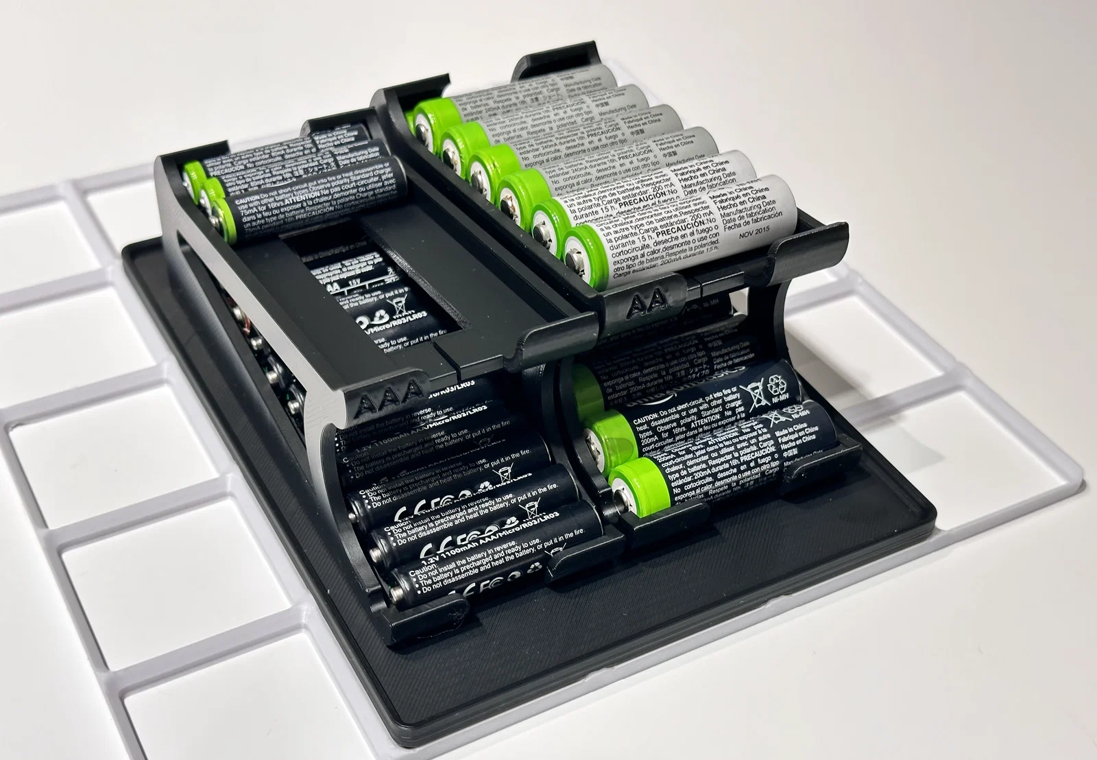 Khay giữ pin dáng thấp cho pin AA và AAA, khớp với tile Gridfinity 3x4. In PLA layer 0.2mm, không cần support, infill 15% (có thể giảm 10% hoặc 5%). Ráp 2 phần rồi đặt lên base plate Gridfinity.