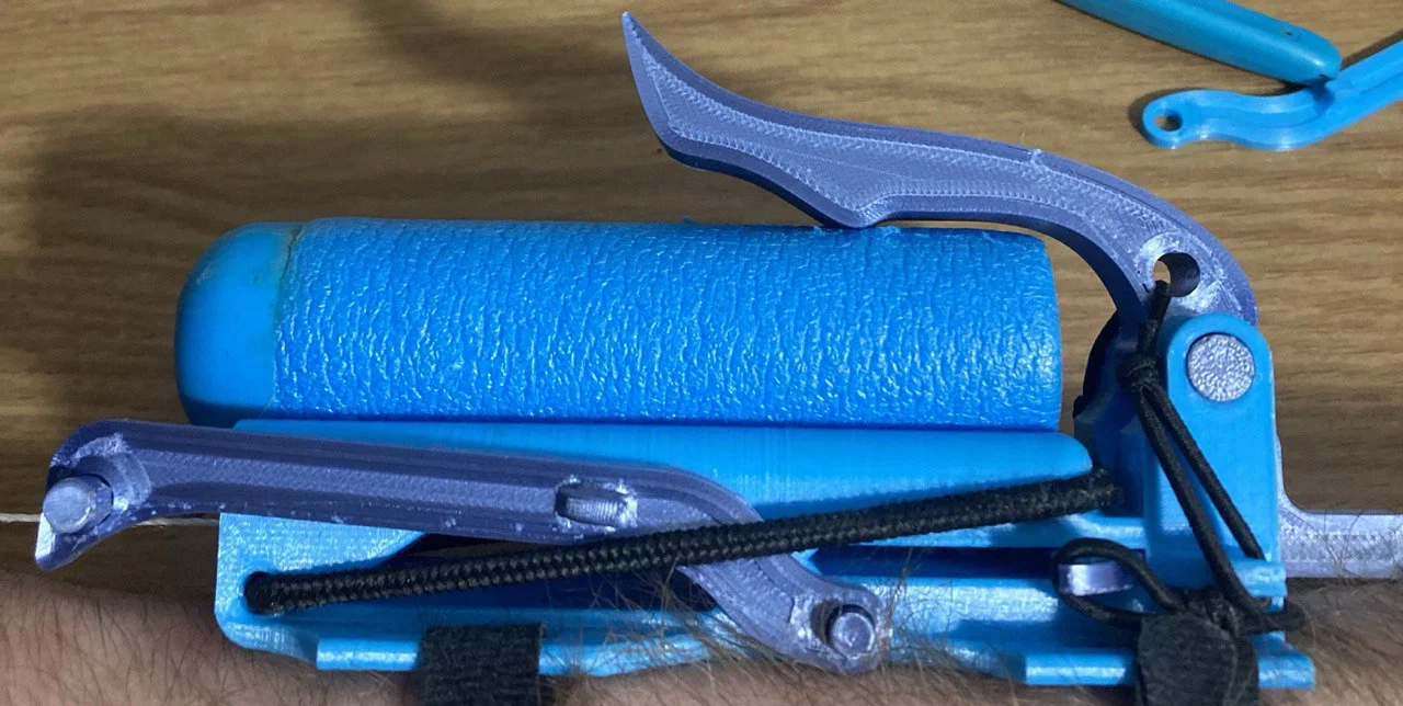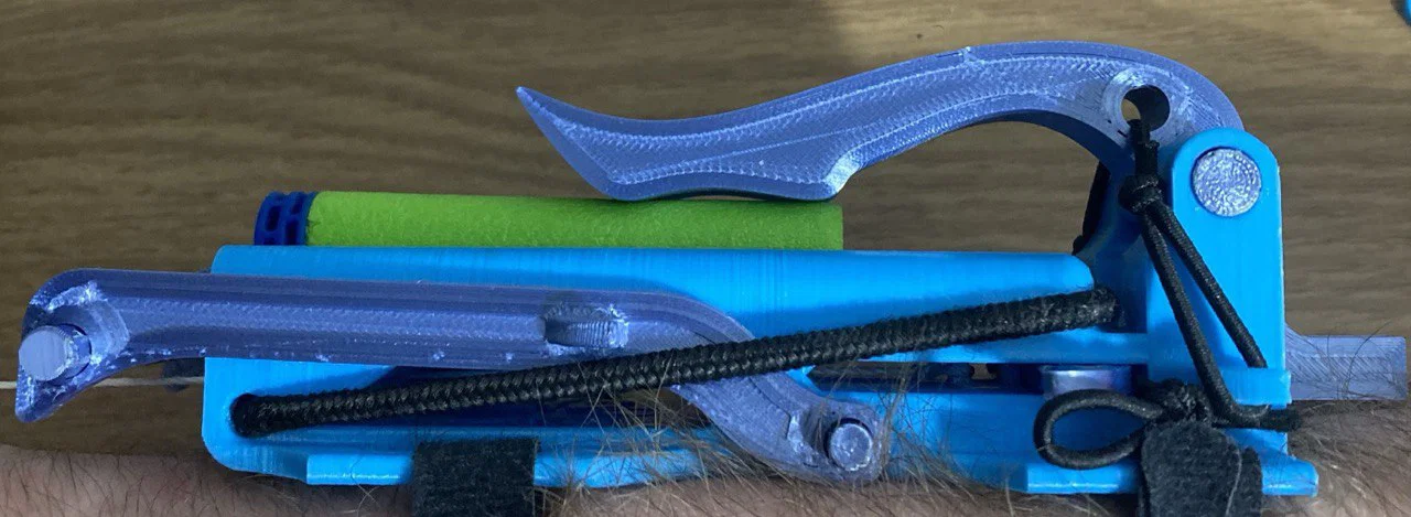Đeo cái ring vào, để phần “duck bill” hướng về phía khớp ngón tay của bạn. Trượt Aristocrat lên phía trước cánh tay bạn xa nhất có thể. Vì giờ bạn phải buộc sợi String sao cho gập cổ tay xuống sẽ kéo trigger, nên nếu bạn canh chiều dài String đúng ngay bây giờ mà sau đó Aristocrat lại trượt lên trước nữa, thì nó sẽ không kích được. Bạn sẽ không thể kéo trigger hết hành trình chỉ bằng cổ tay. Luồn sợi String qua lỗ trên đỉnh của ring và hơi ngửa cổ tay lên. Canh cho sợi dây căng (nhưng chưa tới mức kích Aristocrat!) rồi buộc lại. Mục tiêu là khi bạn hất cổ tay xuống, sợi dây kéo trigger hết hành trình. Image 6 thể hiện cấu hình lý tưởng.
