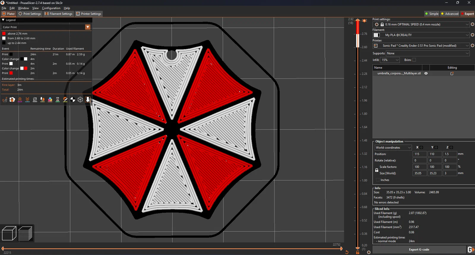 Mẫu móc khóa Resident Evil với logo Umbrella Corporation, thiết kế bằng Oneshape. Kích thước 35x35x3 mm, tối ưu in PLA, không cần support/raft. Có hướng dẫn đổi màu thủ công bằng G-code M600 để in đen–trắng–đỏ.