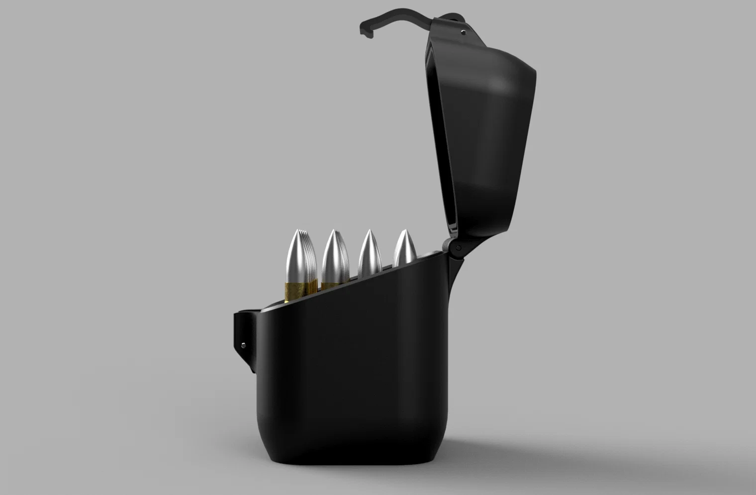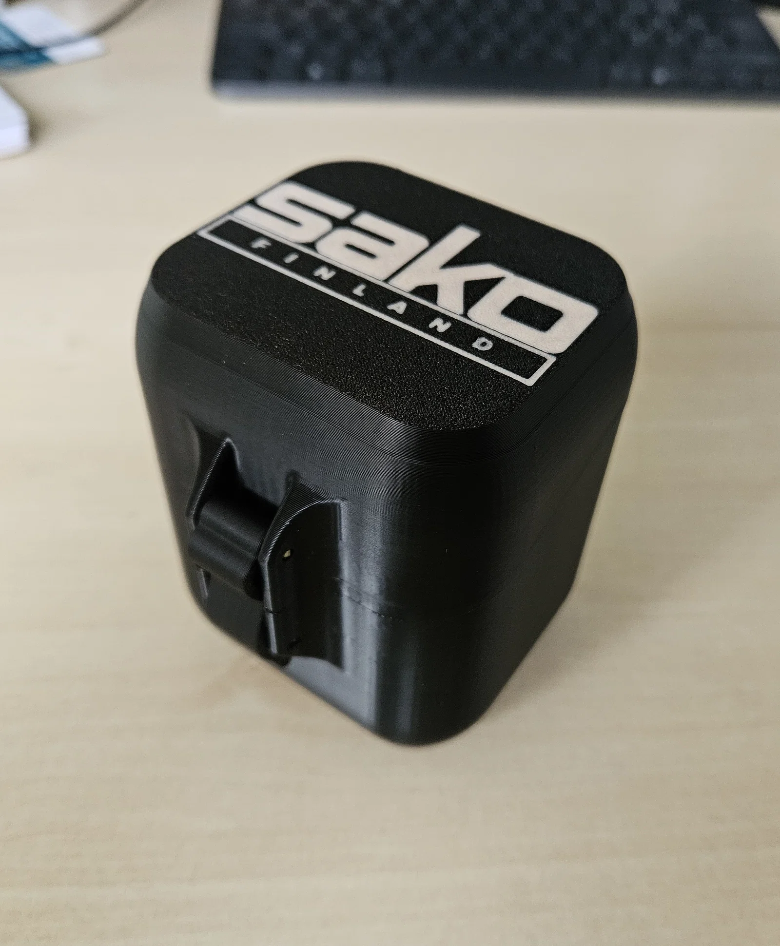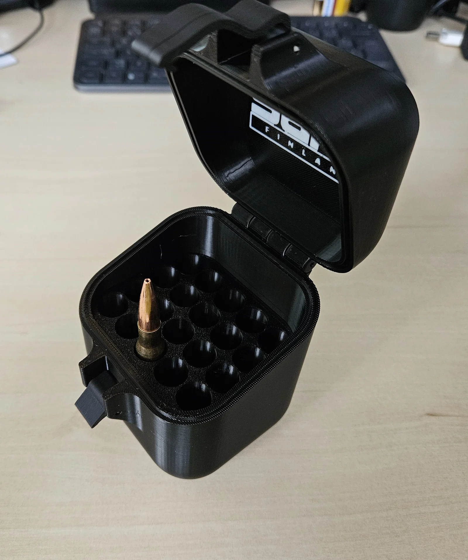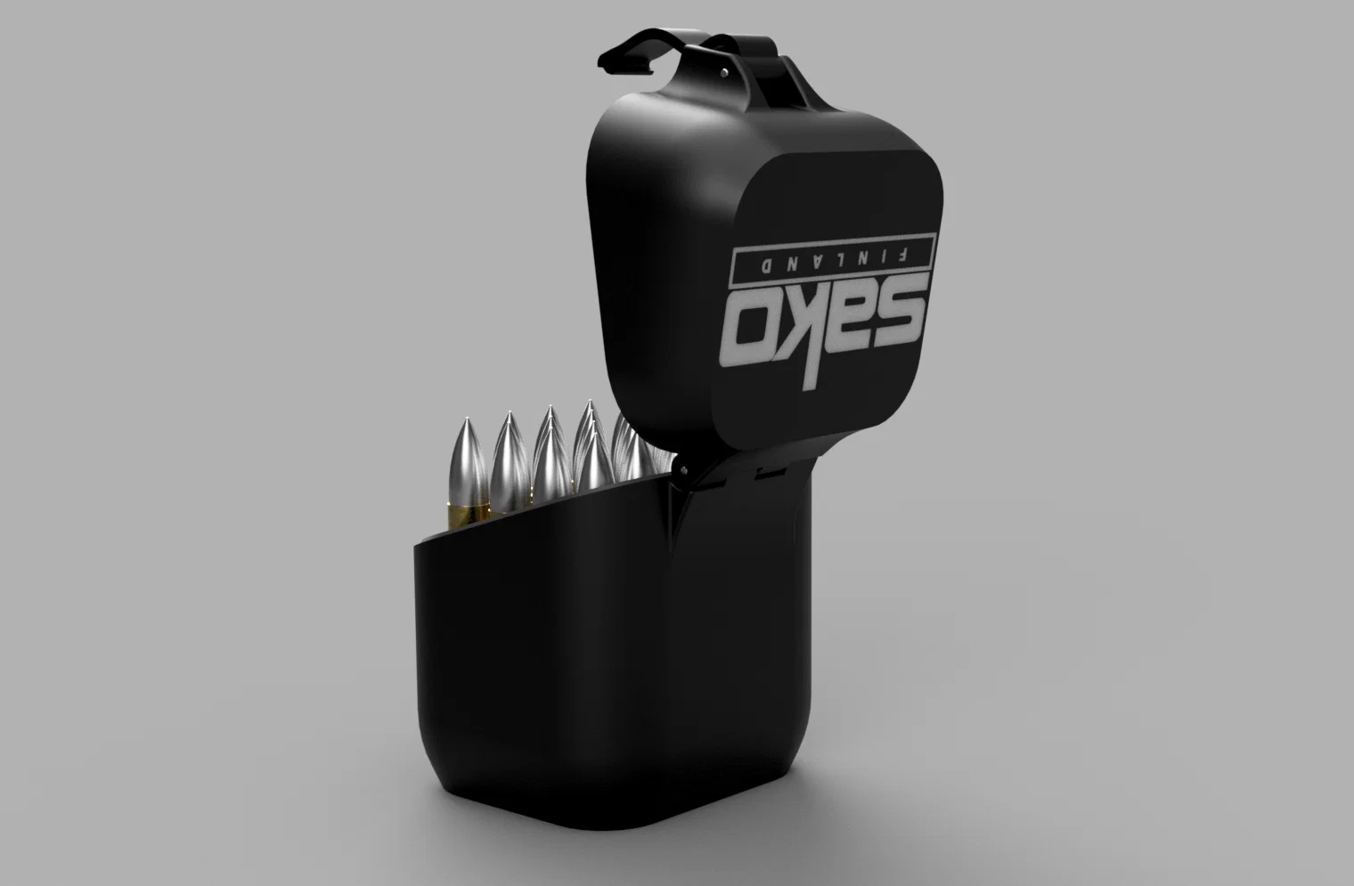 Hộp đạn 30-06 SAKO theo mẫu mới, bố trí 20 viên (86,50 x 12,60 mm). Có rãnh o-ring cho dây 2mm, bản lề và khóa dùng chốt hàn TIG 2mm. Gợi ý in 0,2mm layer, 2 perimeter với eSun ABS.