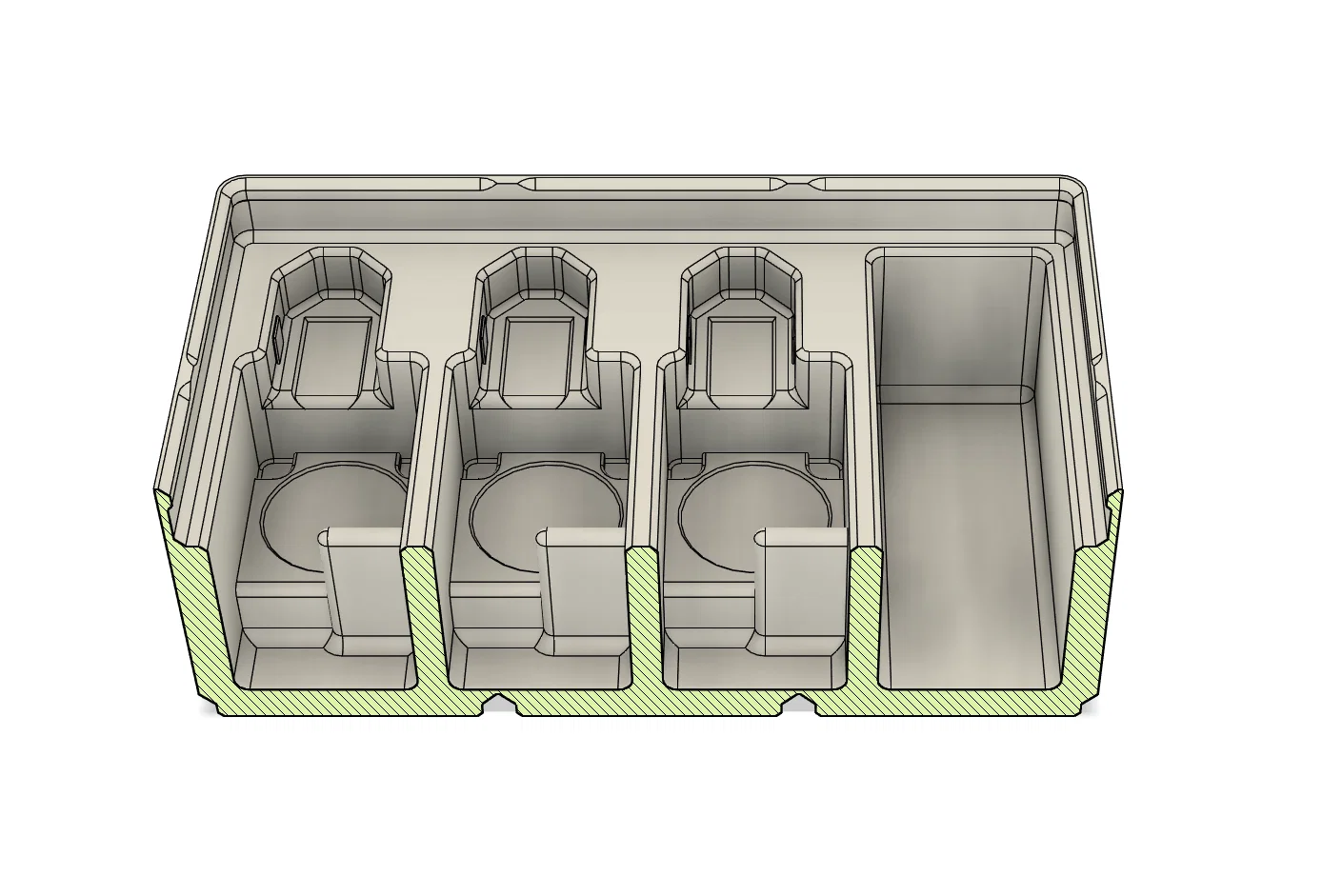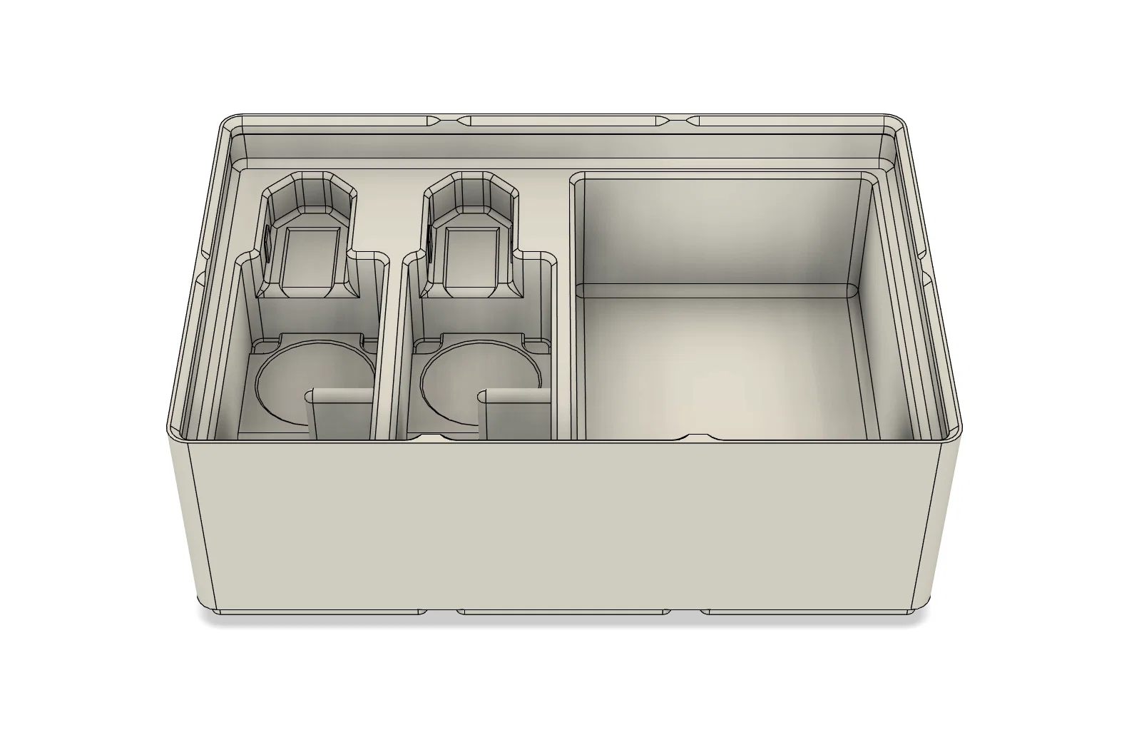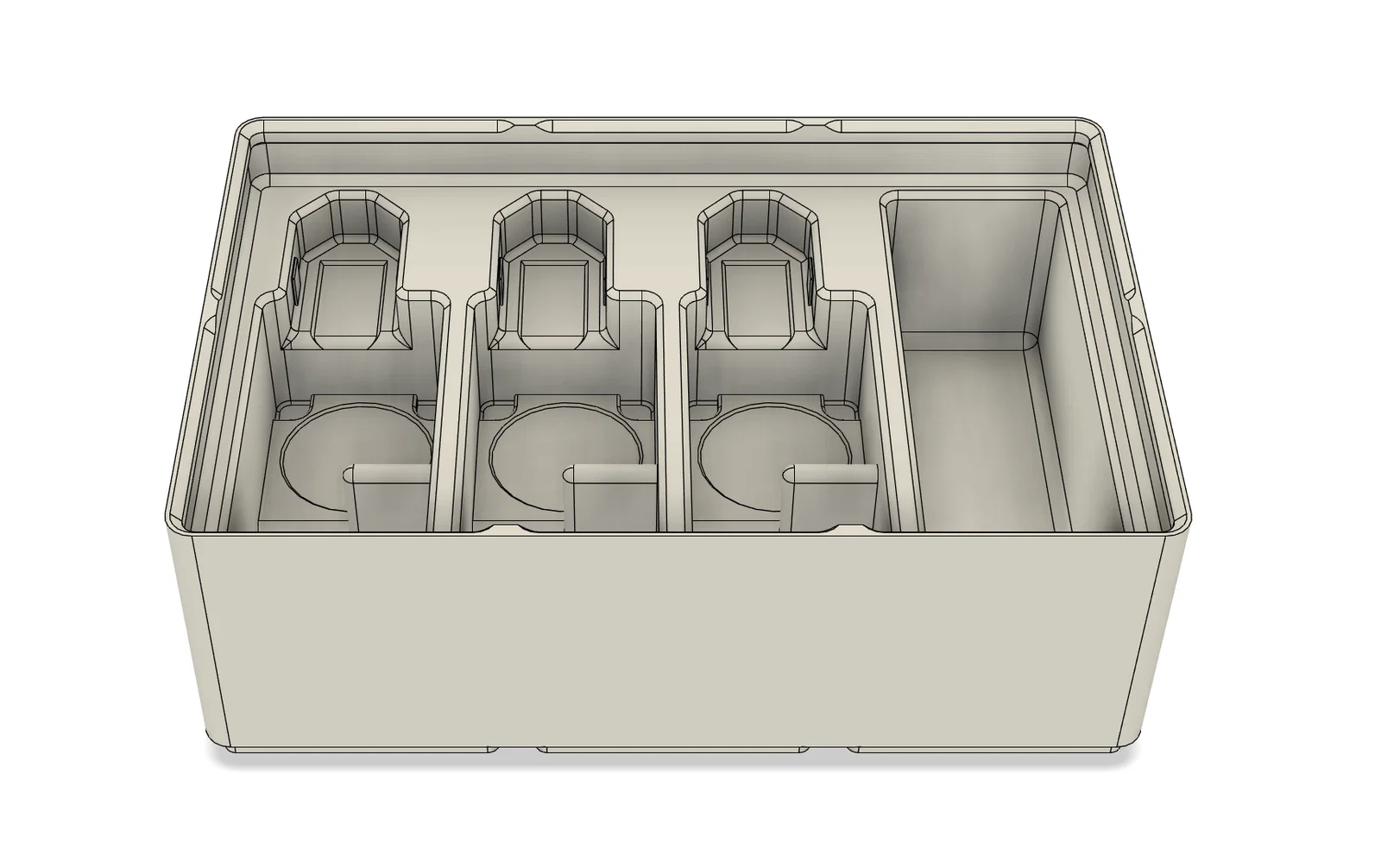 Vì đa số thiết kế khác hay làm lỗ/slot riêng cho đủ thứ, thành ra либо là để trống nhiều ngăn, либо là nhét không đủ đồ — nhất là mấy con ốc? Ai mà cất ốc làm gì, bạn dùng luôn 2 con ốc đã có sẵn trong hotend rồi ;) — nên mình làm phiên bản kiểu chỉ có các bin.