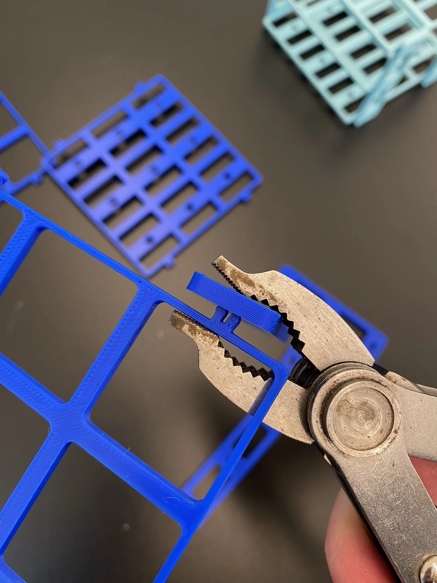 Cái này lắp rất dễ, chỉ cần một cái kềm, bấm các ngàm (clips) vào các khe (slots) ở hai bên hông. Lưu ý canh hai bên sao cho cái “gờ/shelf” trong khe được hướng ra phía ngoài của giá. Khoảng cách được thiết kế để đặt tối đa 9 ống ly tâm 50mL, có chừa chút khoảng hở để dễ lấy ra.