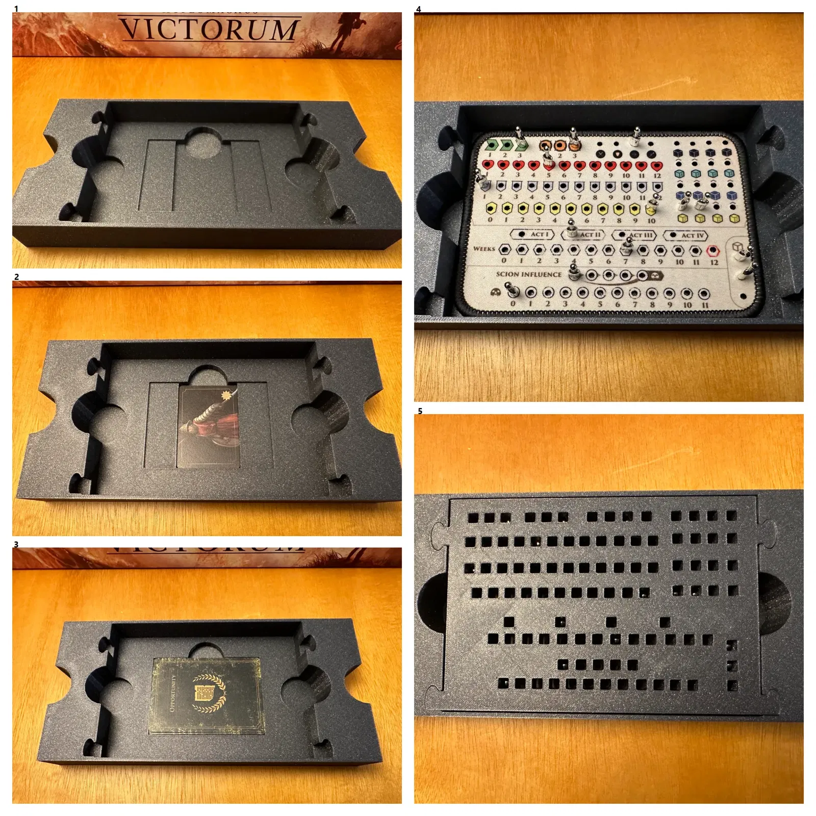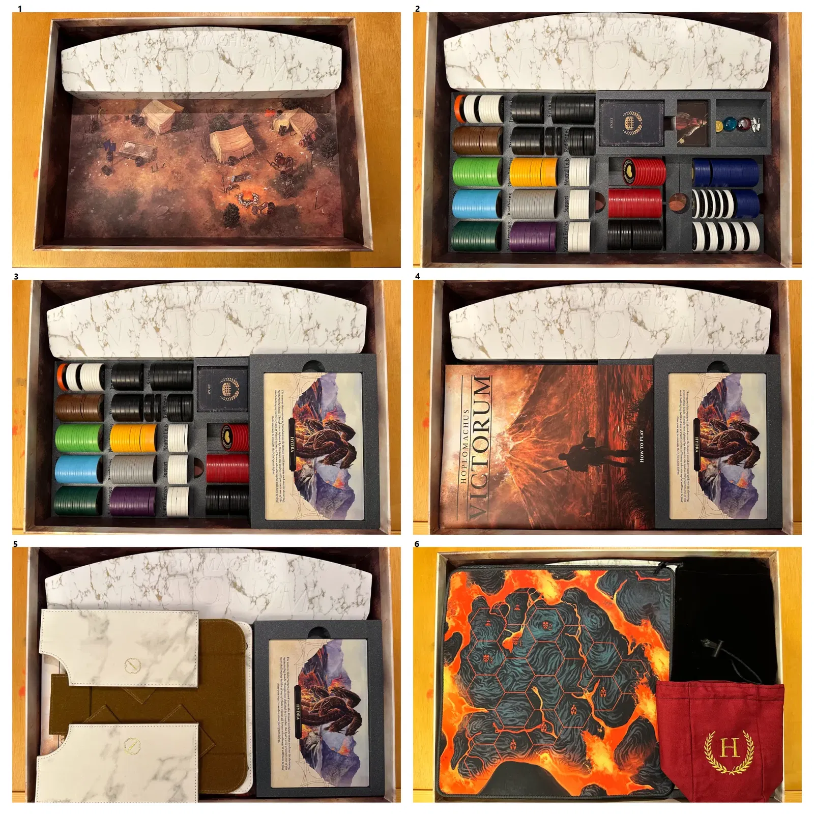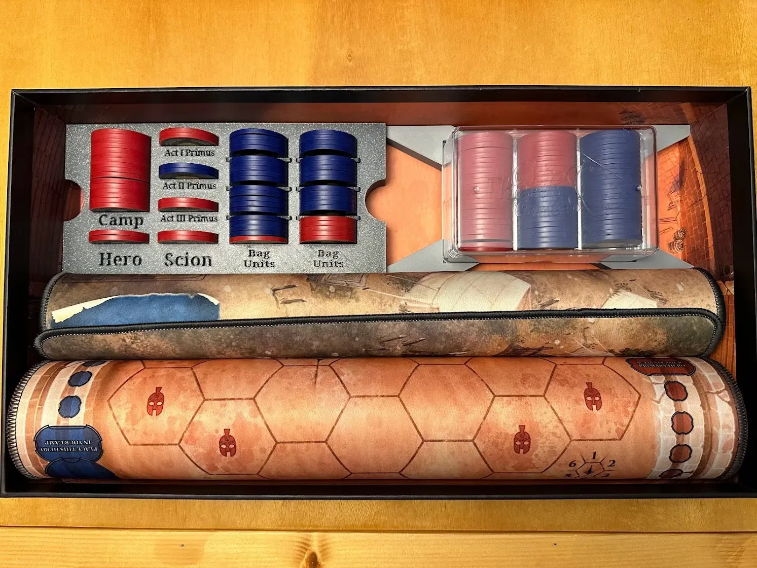 - khay Scion/Immortal. Các khay trại được thiết kế để thay thế các khay tiêu chuẩn của CTG trên tấm thế giới và cung cấp một số tổ chức bổ sung cho chiến thuật, đơn vị đấu trường, cơ chế cụ thể của đấu trường và thẻ tài năng trong một lượt Victorum. Tôi thường giữ xúc xắc, hạt và kiếm nhựa dư thừa của mình trong khu vực thành phần tròn. Sân vận động vẫn được sử dụng để lưu trữ các chip phe phái (6 mỗi loại), chip cơ hội và một bộ xúc xắc. Các khay trại có thể được sử dụng cho một trò chơi Remastered, mặc dù các chip không phải Remastered sẽ phải được để sang một bên trong suốt trò chơi nếu bạn muốn lưu trữ các chip phe phái bên cạnh sức khỏe. Hộp Remastered bao gồm: - hệ thống lưu trữ cho các lượt chơi Victorum - khay lưu chip - Khay lưu chip bao gồm các khe chia để ngăn chặn chip trượt xung quanh hoặc để tổ chức thêm. - In 8 khe chia để đảm bảo phủ đầy đủ. - thảm hero neoprene + khay lưu thẻ sức mạnh/sự kiện