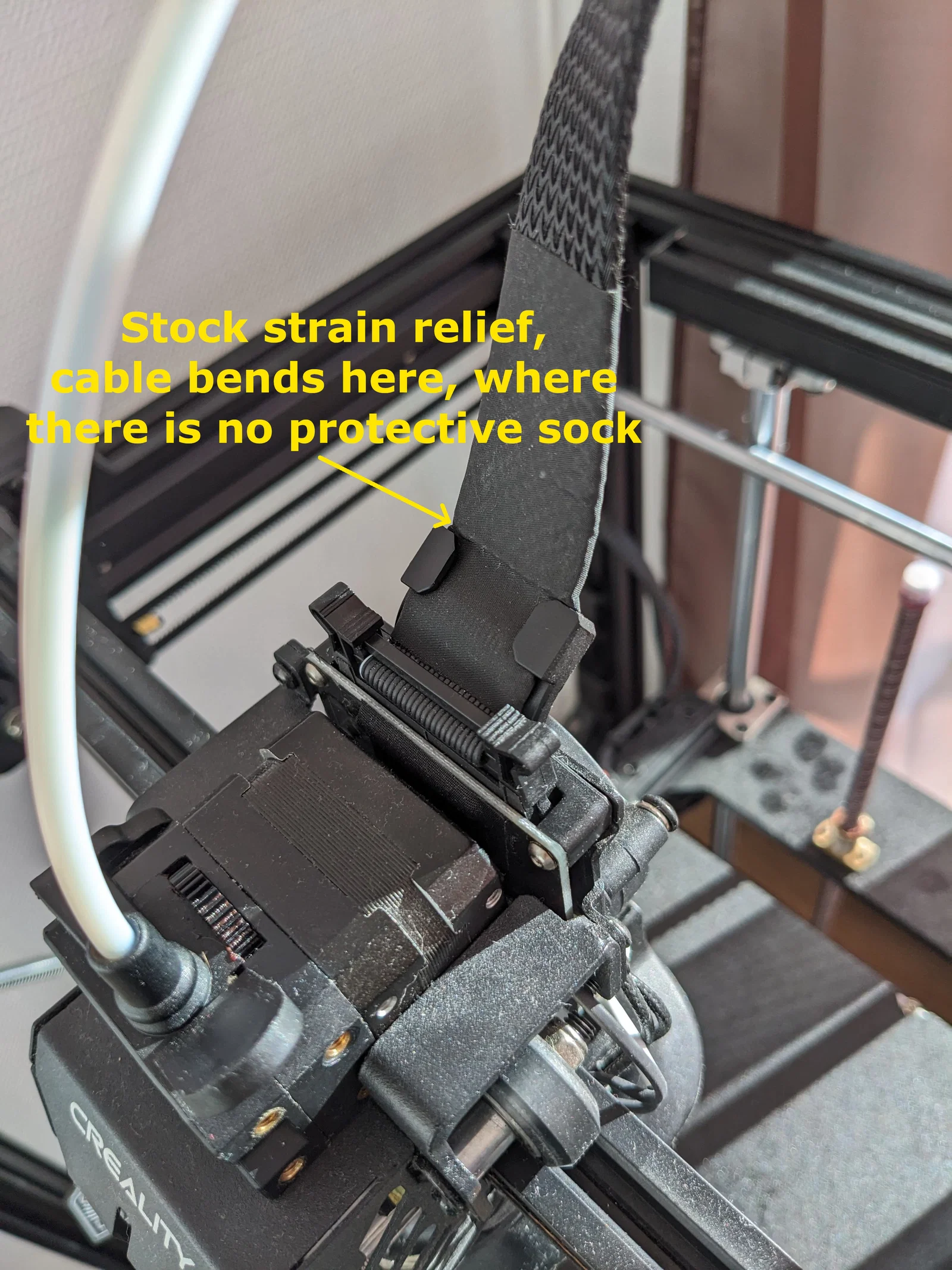 Bạn đang sở hữu máy in 3D Ender-5 S1 và cảm thấy lo lắng về phần cáp nối đầu in? Đây là một vấn đề khá phổ biến khi phần cố định cáp đi kèm theo máy (stock strain relief) bị thiết kế hơi ngắn. Việc này vô tình tạo ra một điểm yếu, khiến cáp bị uốn cong quá mức tại vị trí không có lớp bọc bảo vệ, dẫn đến nguy cơ đứt cáp hoặc chập chờn tín hiệu sau một thời gian dài sử dụng.
