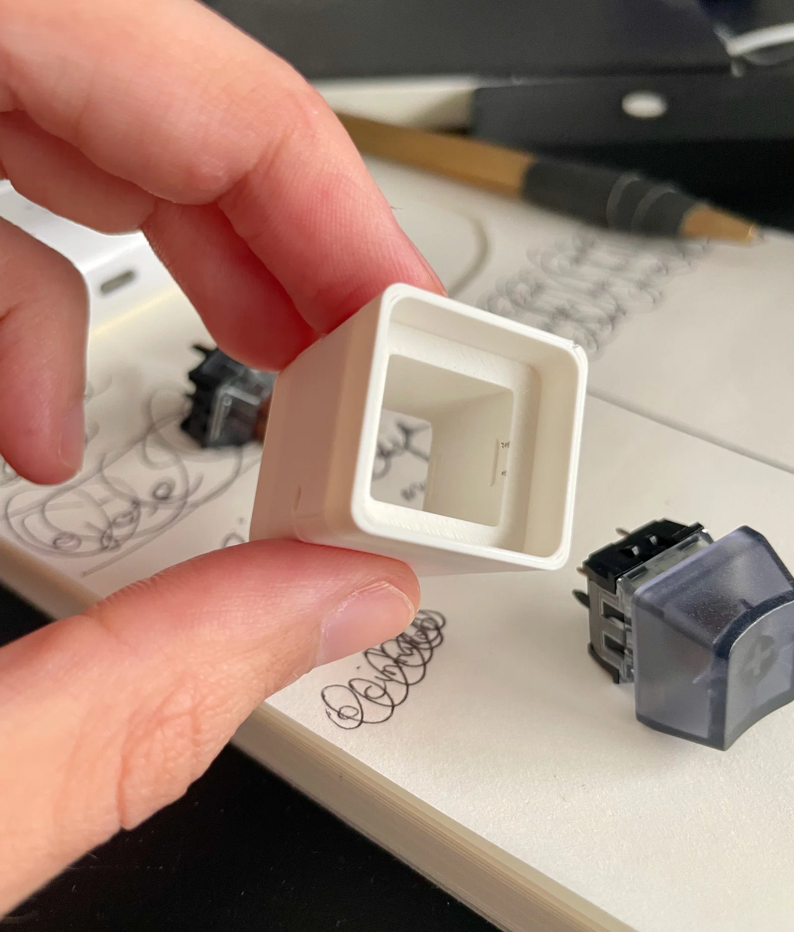 - Lưu ý: Kiểm tra kỹ phần khe gắn switch trong file STL trước khi in để đảm bảo kích thước phù hợp với loại switch Cherry MX bạn đang sử dụng.