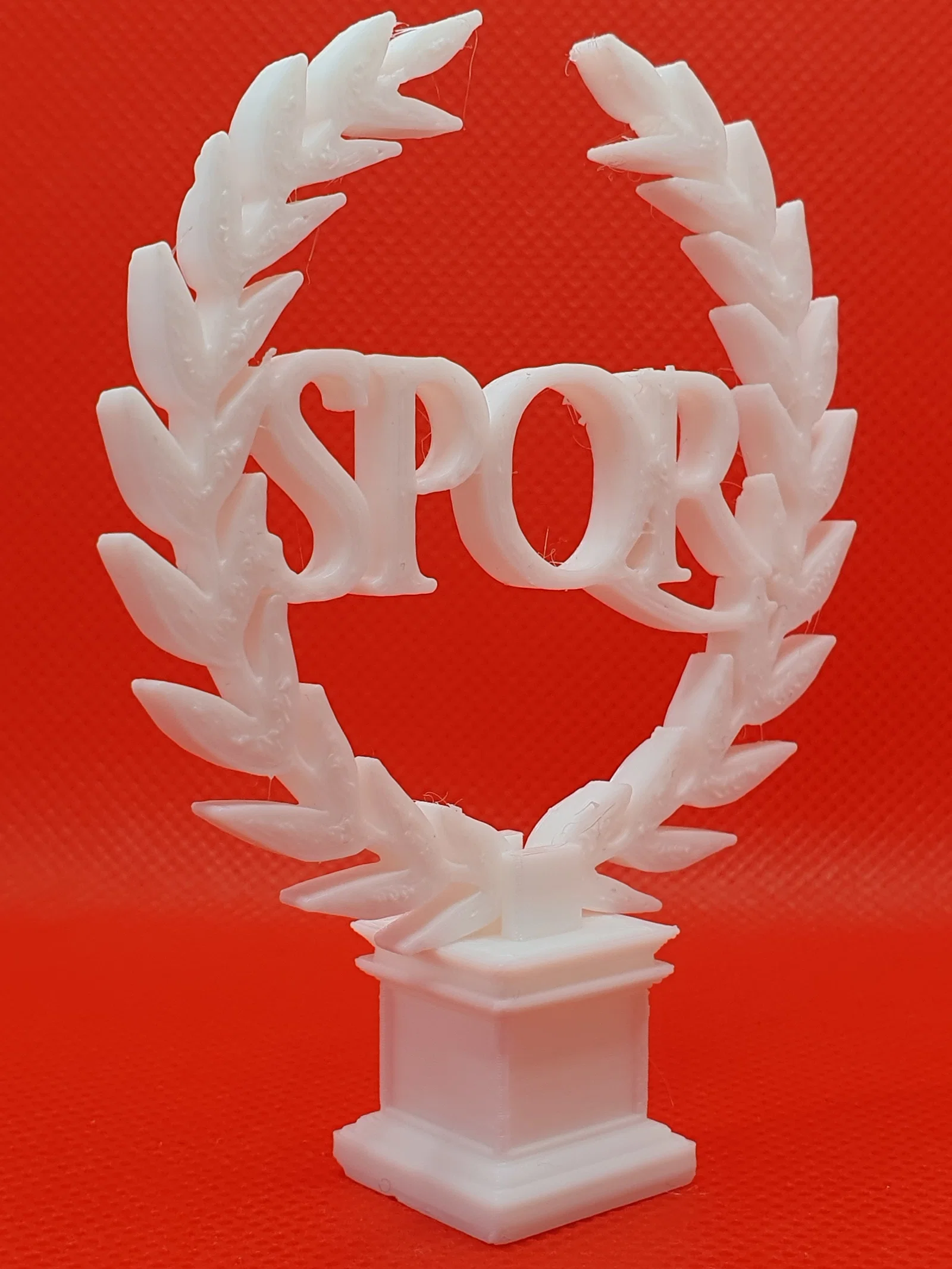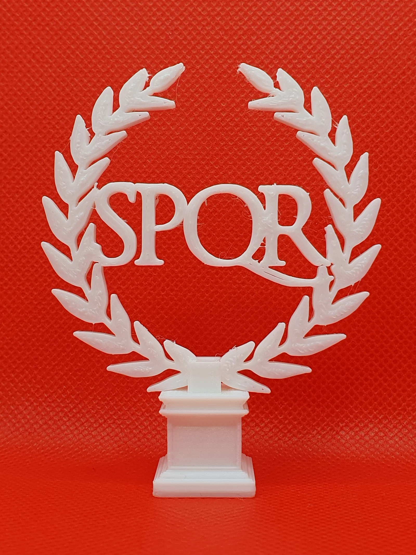 Mẫu “Roman Empire - SPQR” với chữ SPQR nằm giữa hai nhánh nguyệt quế đặt trên bệ. Thiết kế gồm 2 phần (chữ + pedestal support) có thể print in place; đã test 0.2mm và scale 638.27%.