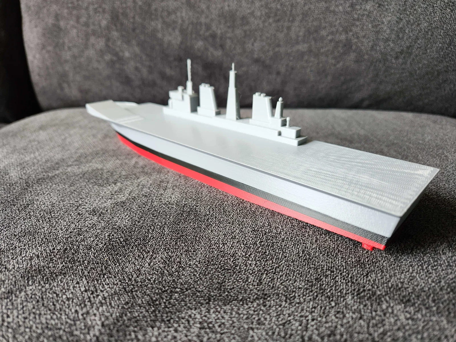 Mẫu tàu sân bay hạng nhẹ hiện đại, đơn giản hóa từ bản ROBLOX để in 3D, lấy cảm hứng mạnh từ Invincible-class. Có hướng dẫn cắt bằng PrusaSlicer, đổi màu, dùng supports và thêm mouse ears để hạn chế cong vênh.