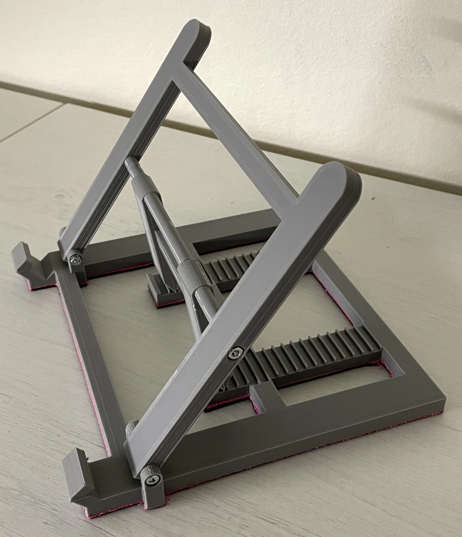 Mẫu giá đỡ MacBook Air để bàn dạng gấp gọn, tiện mang theo. Hướng dẫn lắp ráp dùng ty ren M3 180mm, vít M3 30mm và 6 đai ốc M3; có mẹo dán mousepad mỏng bằng băng keo hai mặt để chống trượt.