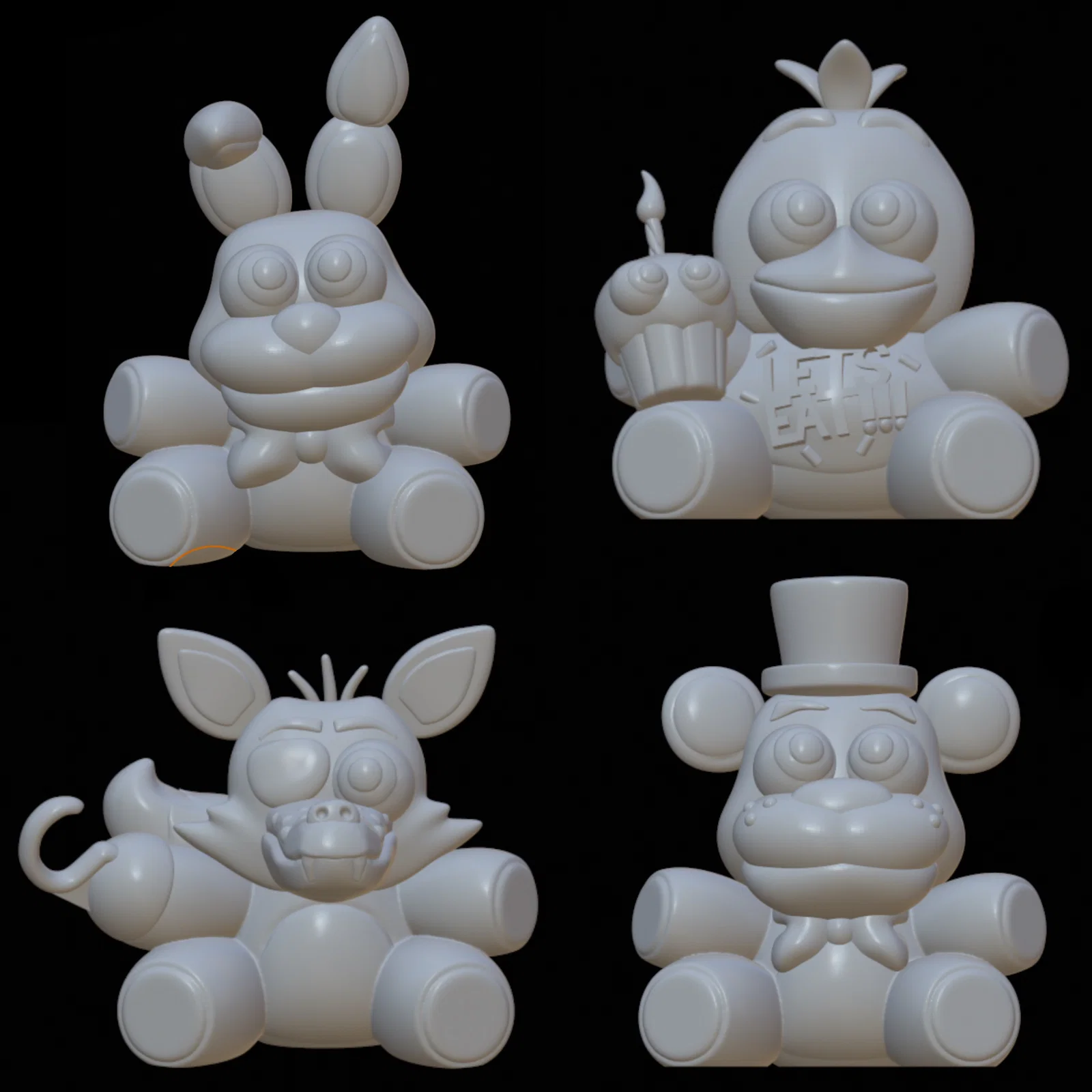 Bộ Fnaf Plushies dễ thương, in không cần supports. Có kèm file mắt và body base để bạn tự thiết kế plushies (không dùng để in). Tô màu bằng acrylic paint bám tốt, muốn đẹp hơn thì dùng model paint.