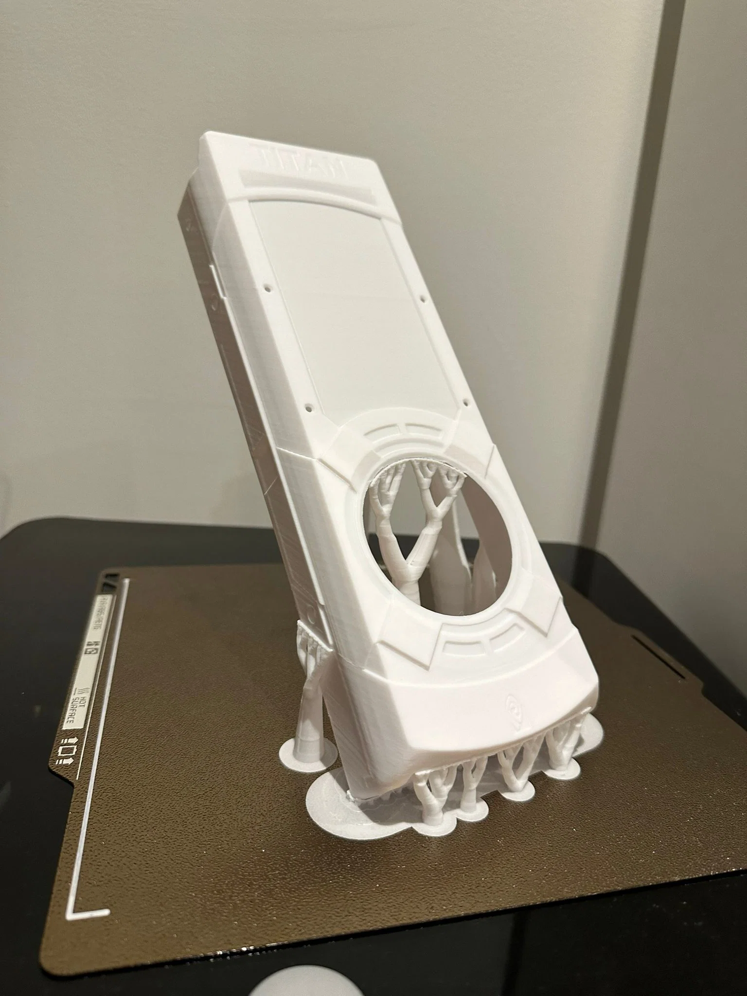 Mẫu ốp che tản nhiệt cho NVIDIA GTX TITAN, lắp được trên Founders Edition (cũng vừa 980TI). Khuyến nghị in PETG (ưu tiên Carbon Fiber PETG) do nhiệt độ; in góc ~45° với supports tự động, tránh PETG bị ẩm gây overextrusion.