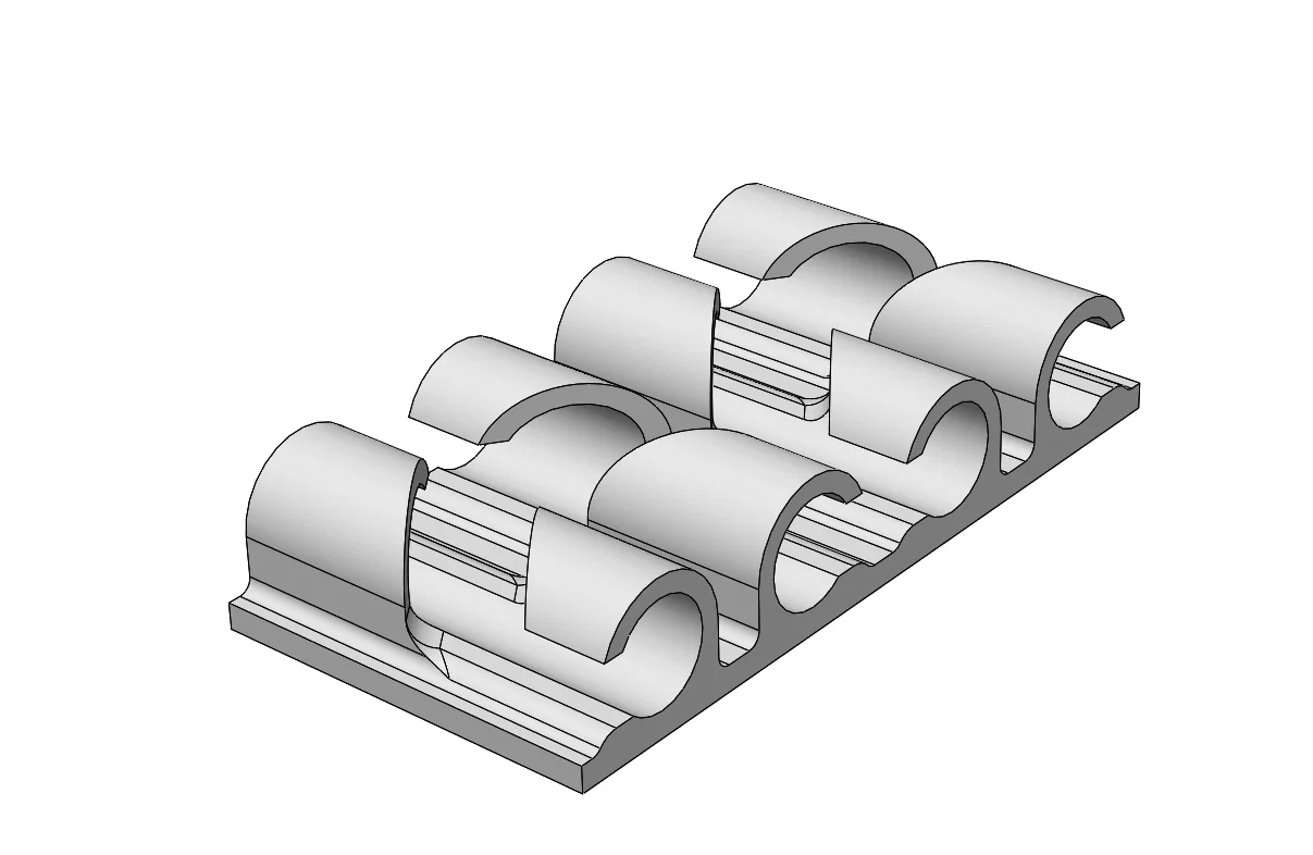 Kẹp cáp đơn giản, giữ khoảng 4 sợi cáp hoặc nhiều sợi nhỏ. Dễ dán lên bề mặt bằng băng keo hai mặt. In không cần support; nên dùng brim để tăng adhesion, tránh bong khi in.