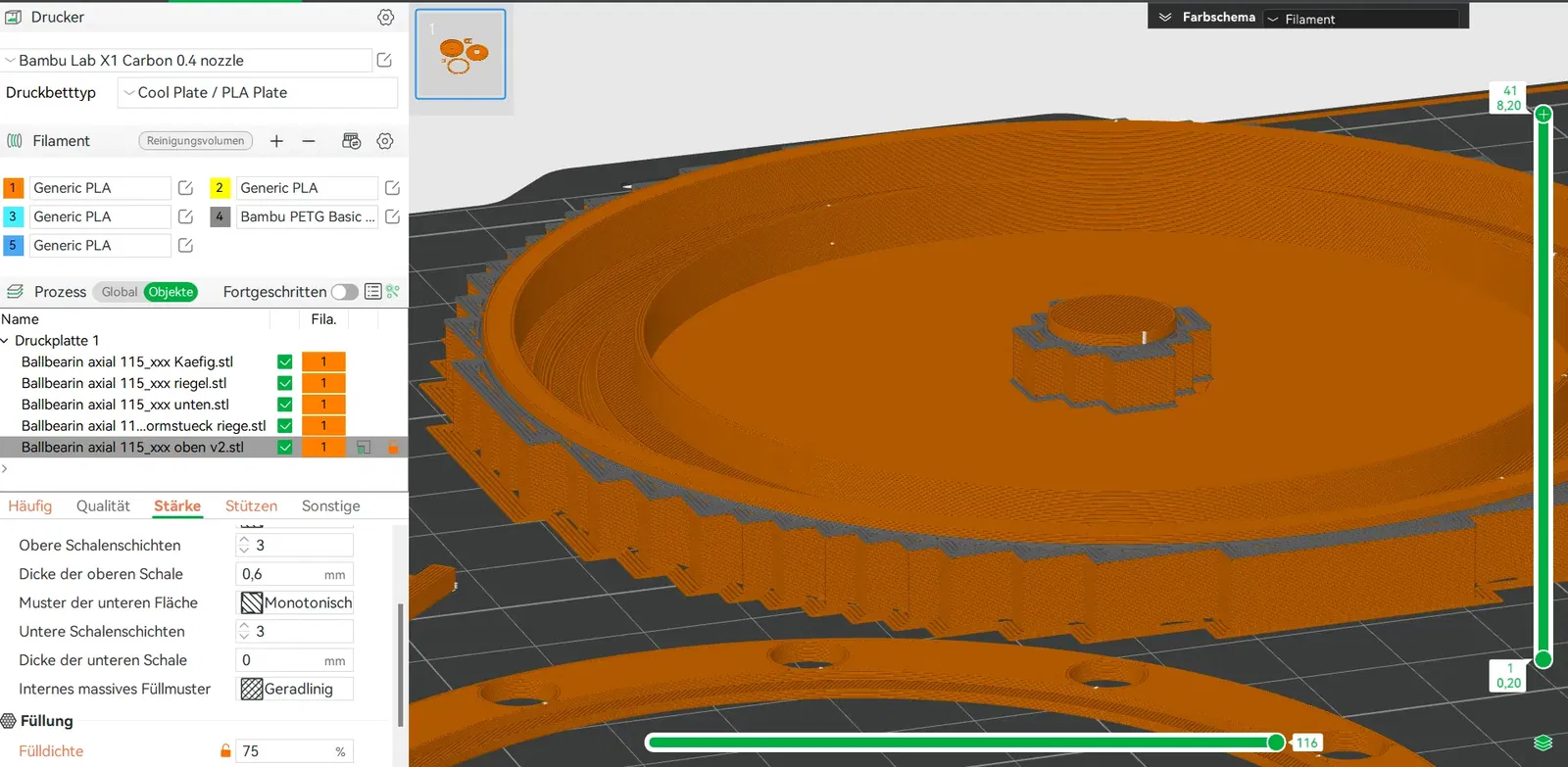 Tôi đã sử dụng PETG làm lớp hỗ trợ, tôi đã có những trải nghiệm tốt nhất với nó (nếu AMS không gây phiền phức…) Các cài đặt có thể thấy trong tệp 3mf (BambuStudio).