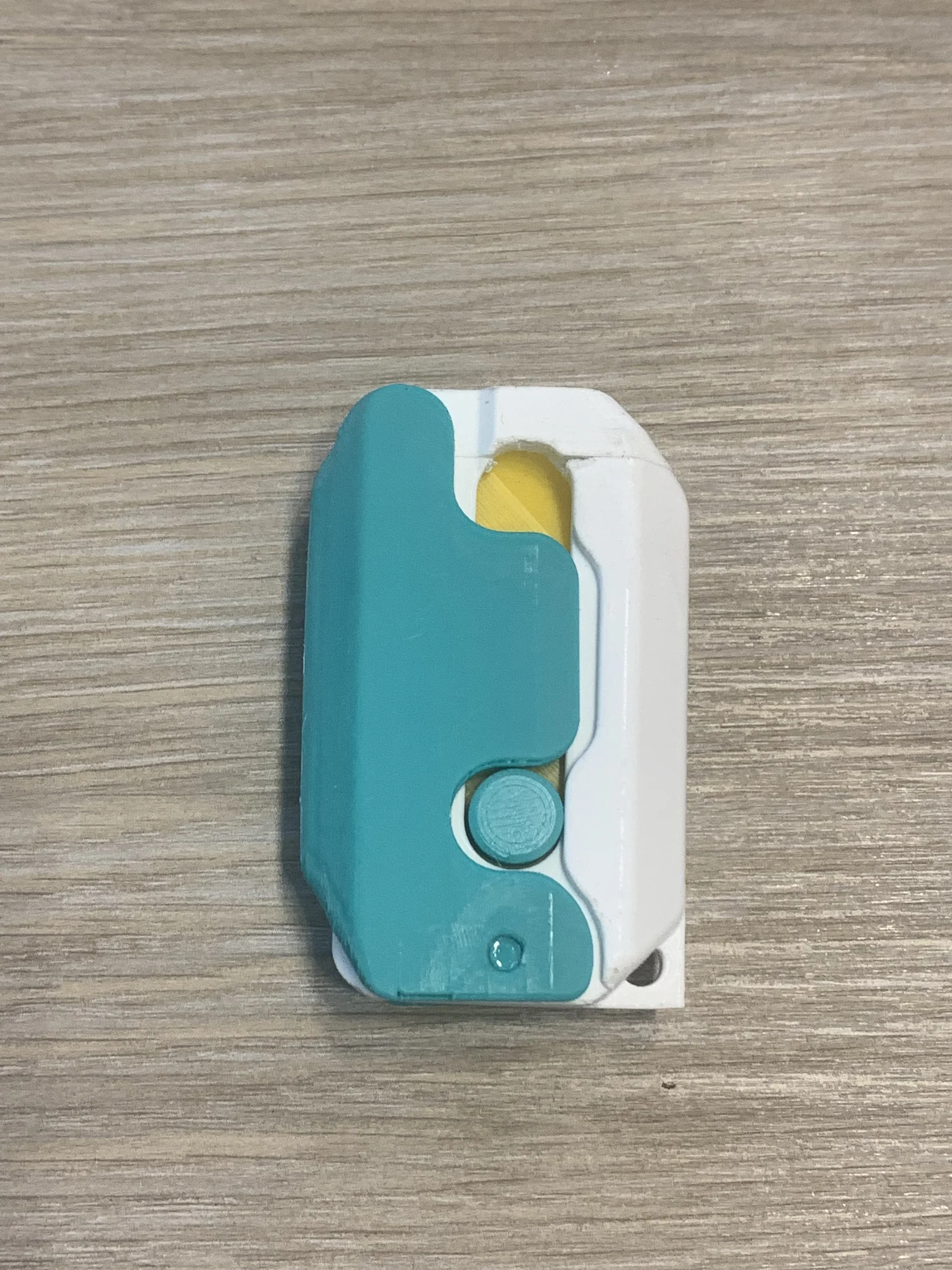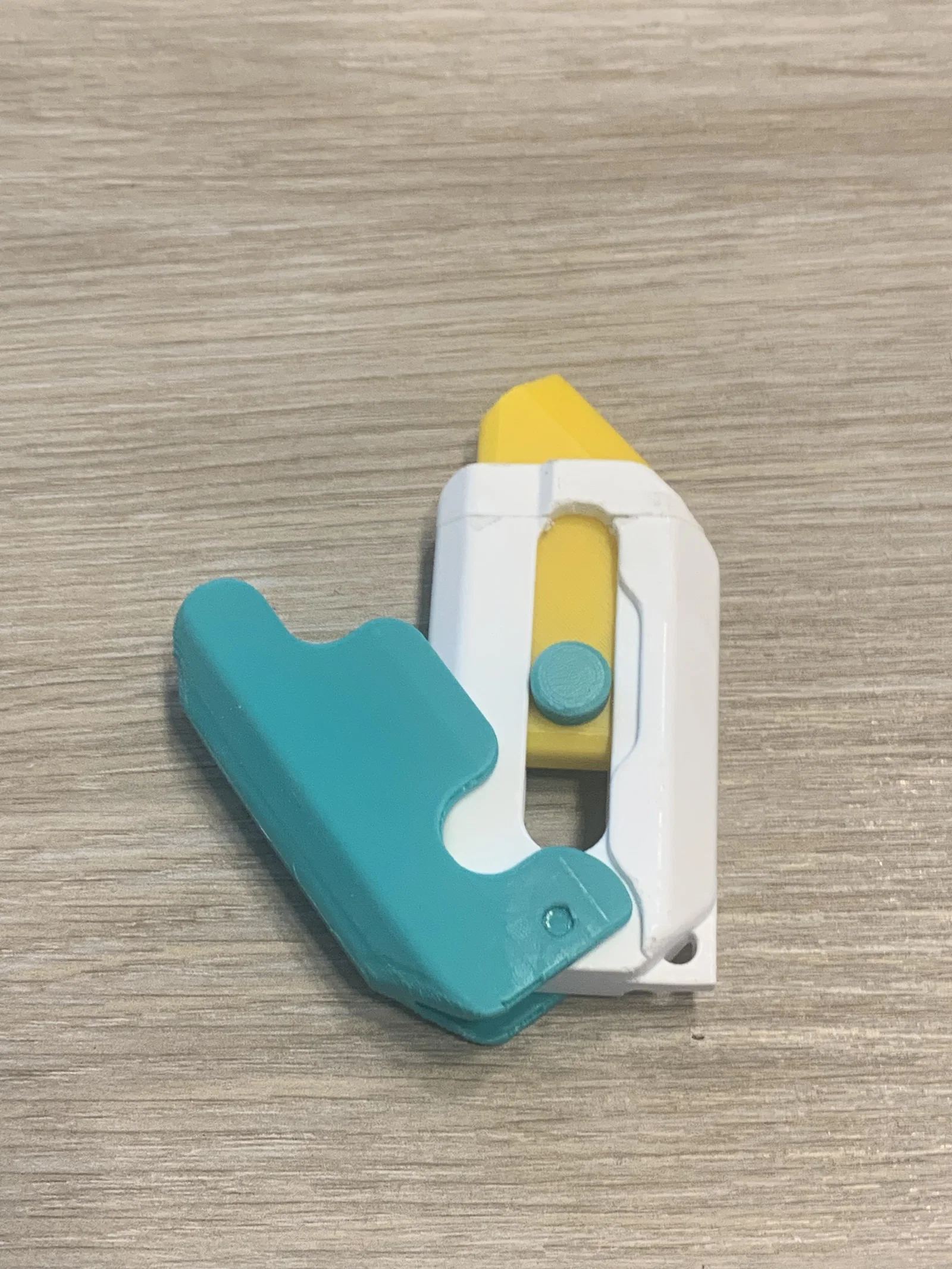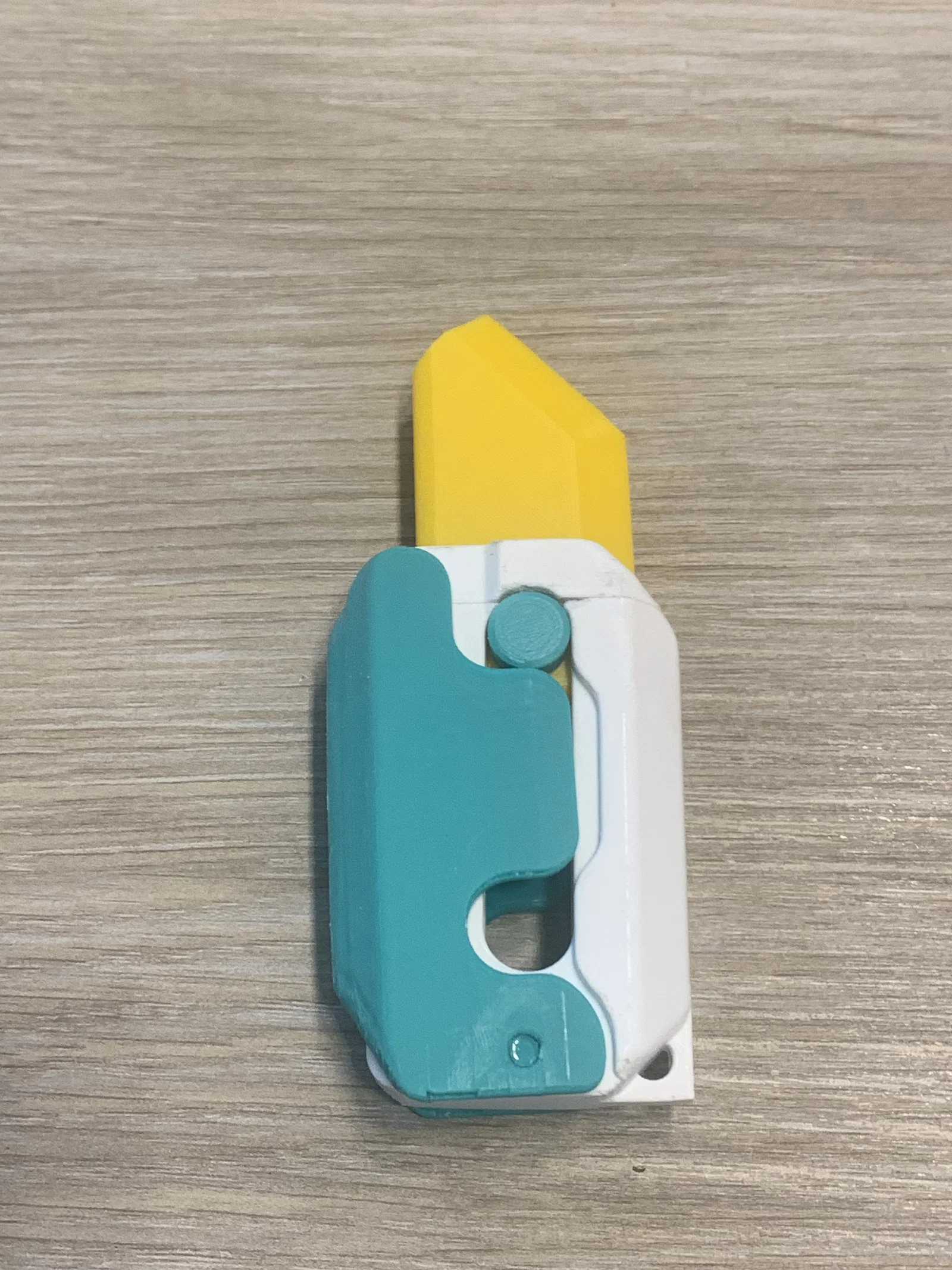 Mẫu 3D gravity knife dạng đồ chơi fidget nổi trên TikTok, thiết kế không có góc cạnh sắc nhọn. Bộ dự án gồm 4 file: grip, blade, shell và 2 pins, phù hợp in nhiều màu (3+ colors).