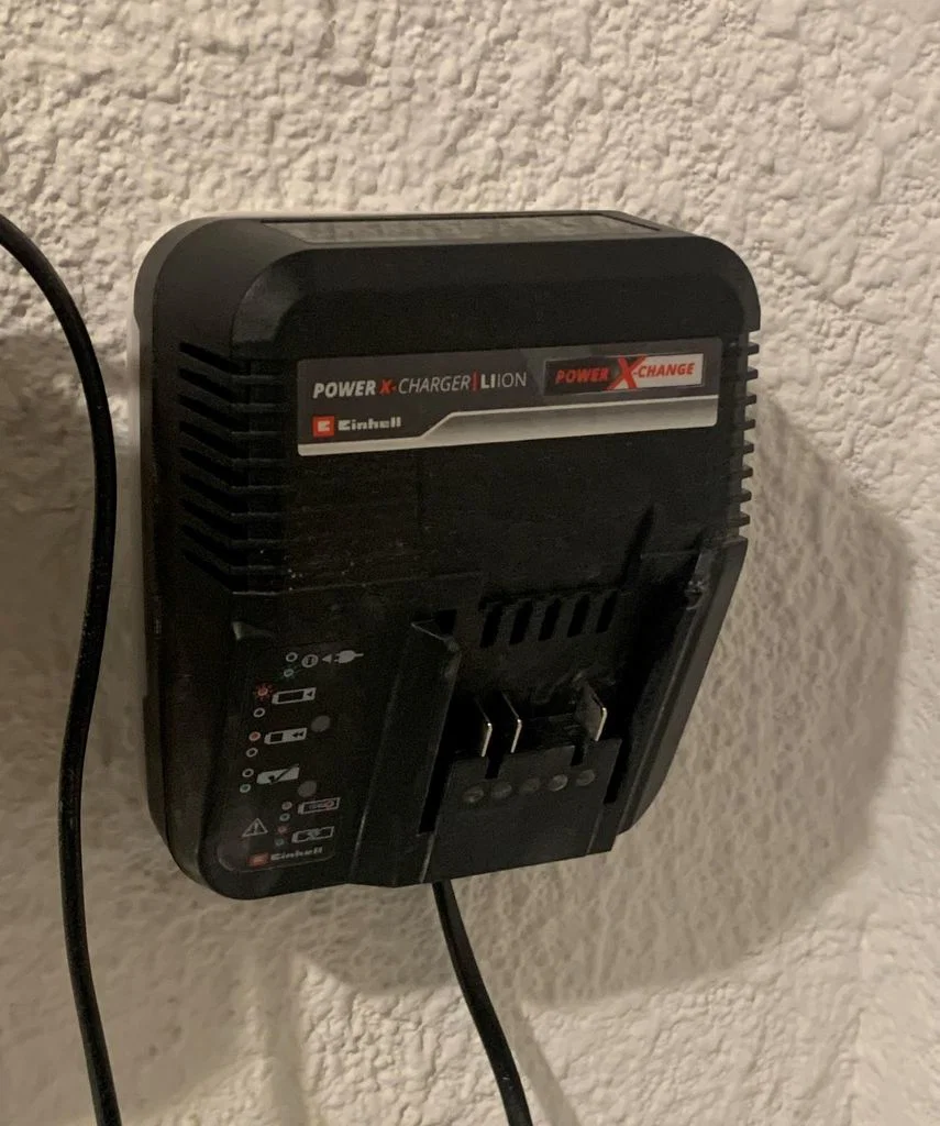 Trong trường hợp của mình, giá treo tường được bắt lên tường bằng bốn vít đầu chìm 4x30. Bộ sạc Einhell được cố định bằng ba vít đầu dù 3x12 và mỗi vị trí dùng hai đai ốc M3 kẹp (khóa) trước và sau tấm. Nhờ vậy có thể tháo bộ sạc ra bất cứ lúc nào.