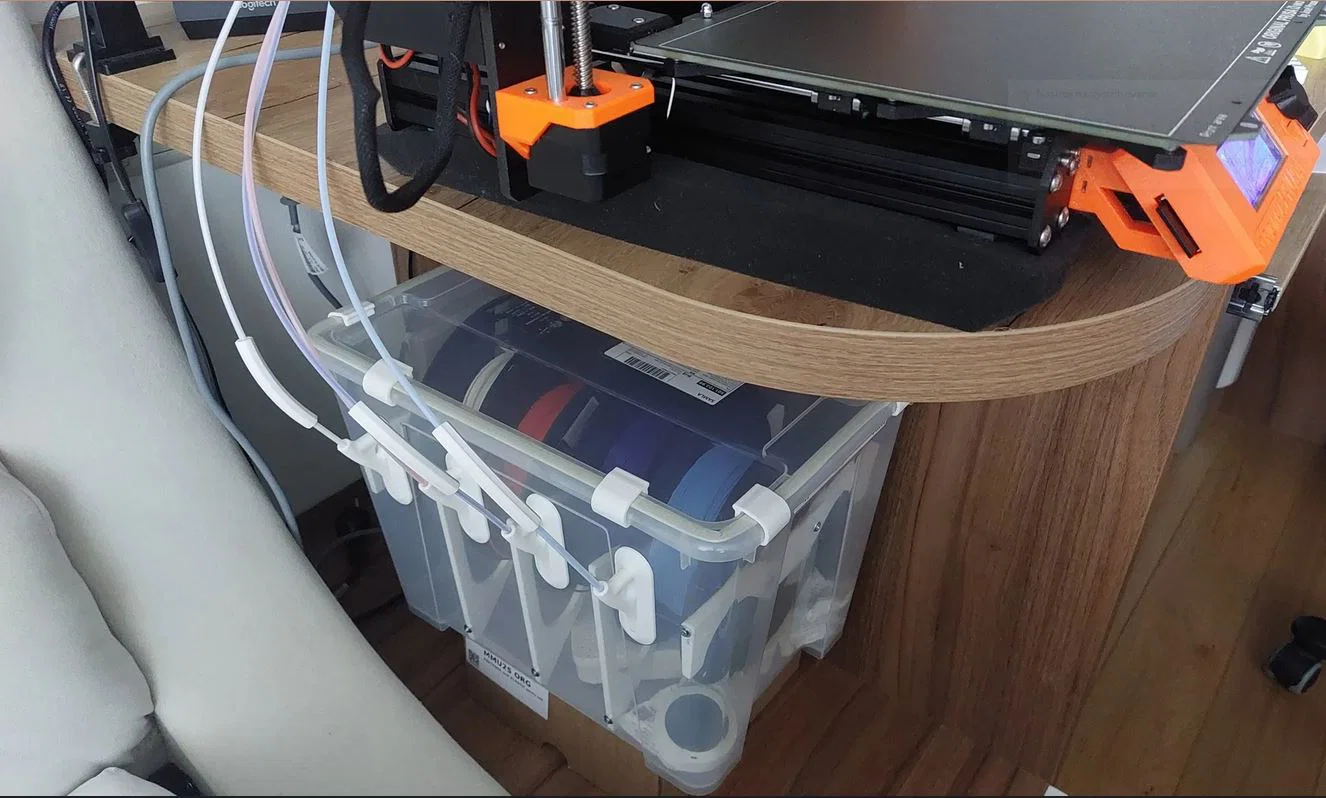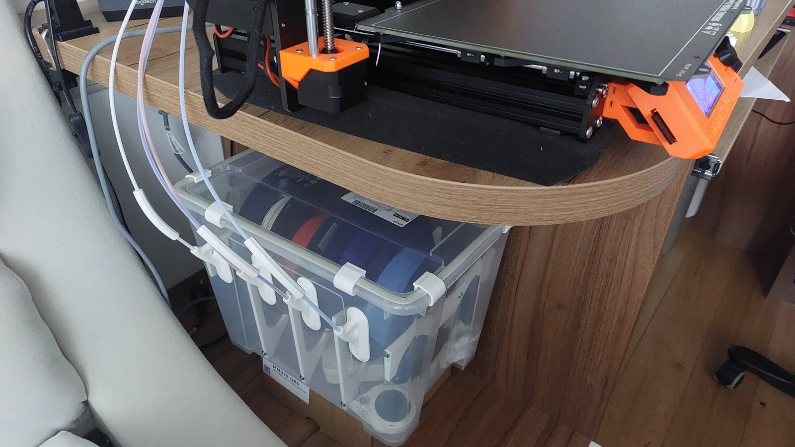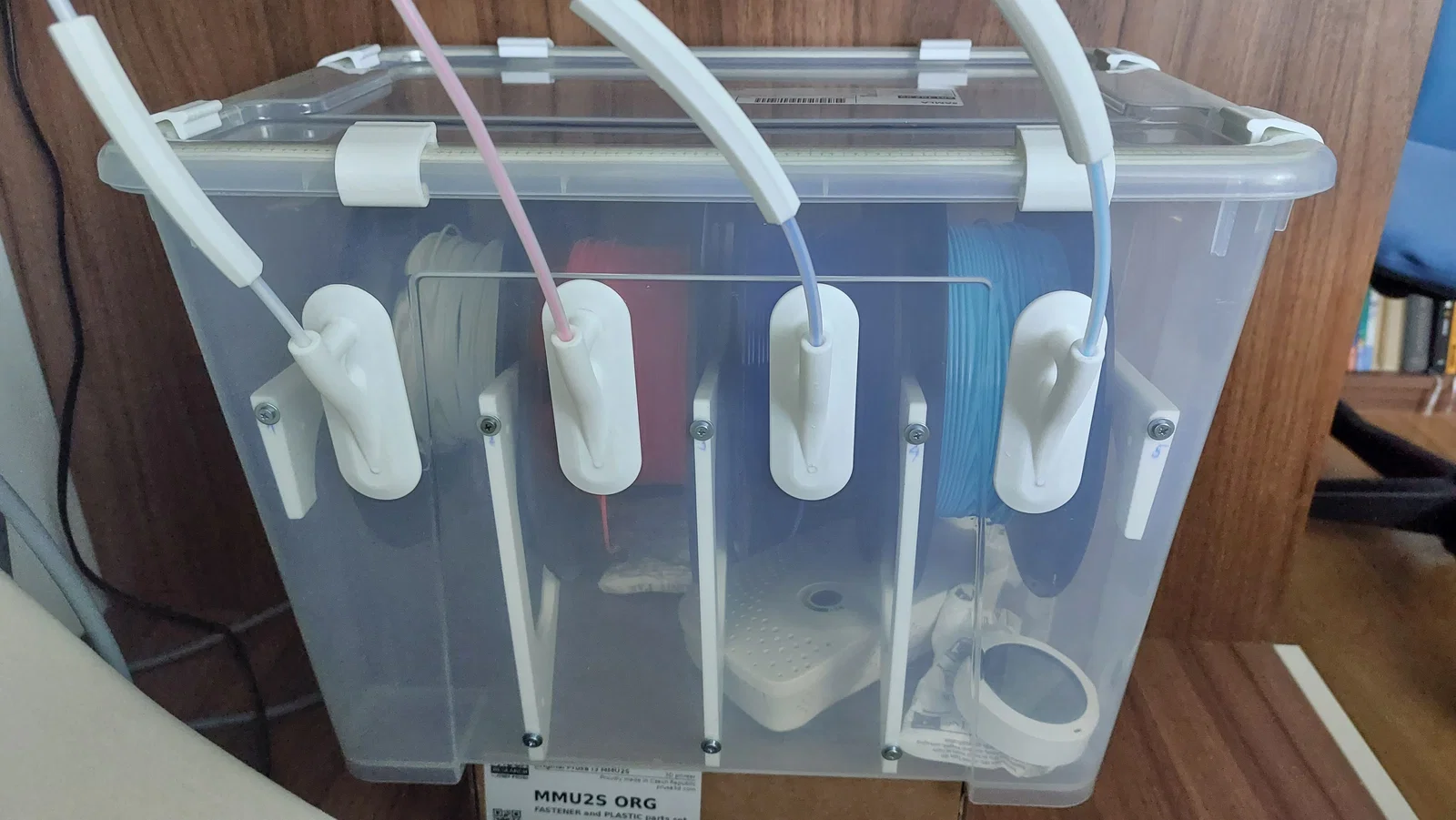Tôi mua MMU2s và suy nghĩ cách giải quyết hộp sấy cũng như bỏ bộ đệm (buffer) đi. Tôi không thích hệ thống giá đỡ đi kèm MMU2s - nó làm cuộn nhựa hay bị rơi ra khiến bản in bị hỏng. Hơn nữa, việc kéo nhựa trong giá đỡ đó rất nặng, dễ gây lỗi với ống PTFE dài.